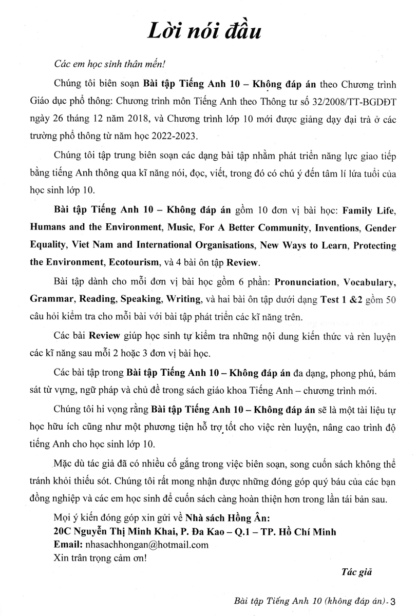 Bài Tập Tiếng Anh 10 - Không Đáp Án (Biên Soạn Theo Chương Trình GDPT Mới) gồm 10 đơn vị bài học: Family Life, Humans and the Environment, Music, For A Better Community, Inventions, Gender Equality, Viet Nam and International Organisations, New Ways to Learn, Protecting the Environment, Ecotourism, và 4 bài ôn tập Review.