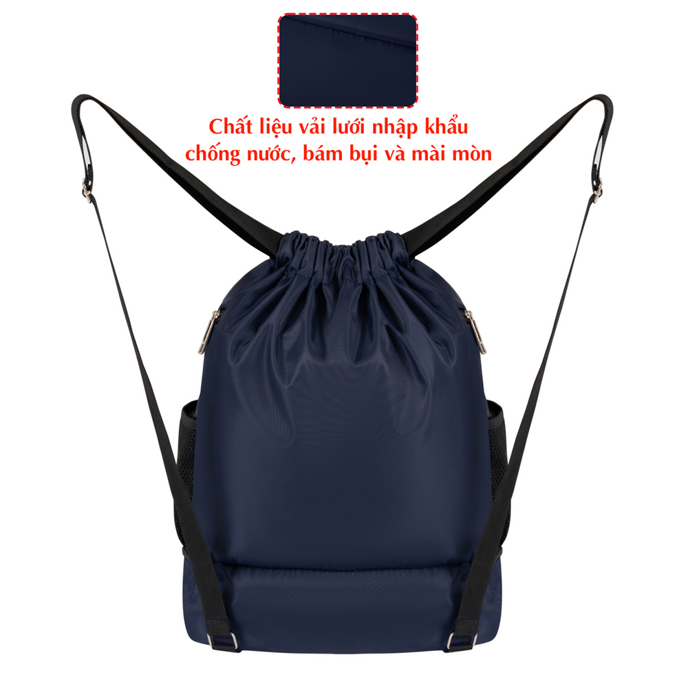 Balo dây rút thể thao chống nước Xbags thích hợp đi tập gym, đá bóng, bóng rổ đa năng Thông tin sản phẩm: Màu sắc: Xanh Đen Kích thước : Dài x Rộng x Cao : 34 x 15 x 46 cm Chất liệu : Vải lưới nhập khẩu chống nước, chống bám bụi, chống mài mòn Form dáng: Thiết kế thể thao, năng động phù hợp với mọi lứa tuổi Thích hợp: Đi học, đi chơi, đi tập thể thao,... Công năng: Ngăn chứa đồ rộng rãi,có ngăn đựng giày riêng, dây rút tiện lợi, khóa kéo bền bỉ, trơn tru, tính thẩm mỹ cao. Mặt sau: Hướng dẫn bảo quản Tránh để trực tiếp các vật có thể lem màu (viết mực, mỹ phẩm) vào lòng túi. Không nên để sản phẩm tiếp xúc nhiều với xà bông. Có thể vệ sinh bằng khăn ẩm và các dung dịch làm sạch đã pha loãng. Trong trường hợp không có sẵn dung dịch làm sạch, có thể pha loãng dầu gội đầu và lau sản phẩm nhẹ nhàng với khăn sạch hoặc dùng cồn cùng một chút ít xà phòng để chà nhẹ lên bề mặt vết bẩn. --------------------------------------- balo dây rút thể thao, balo rút thể thao, Túi