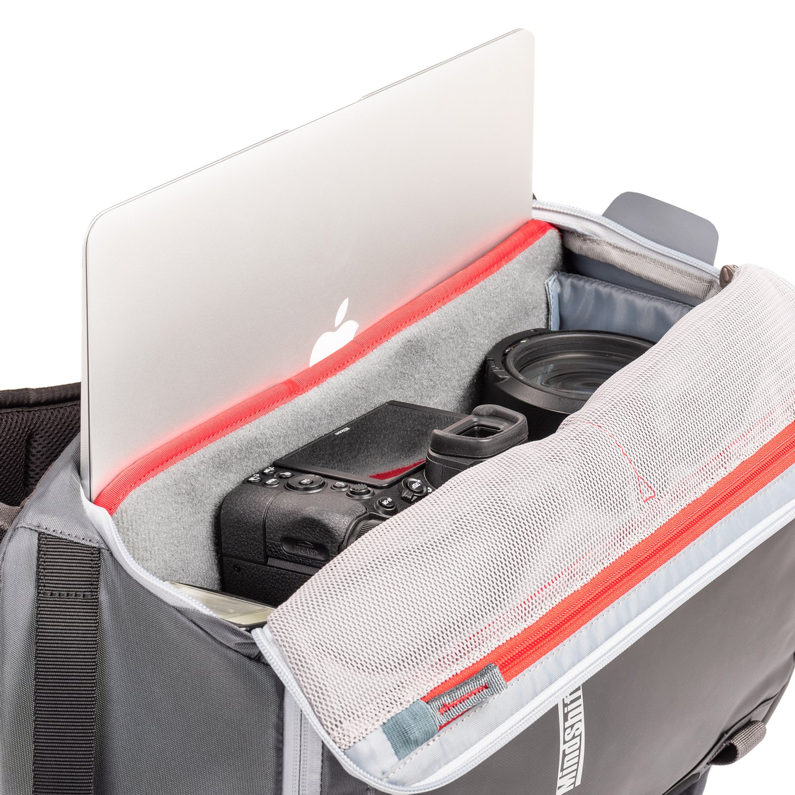 Balo máy ảnh Think Tank Backstory 15 với miệng túi chính ở vị trí phía sau giúp người dùng dễ dàng sắp xếp các thiết bị bên trong , cùng với ngăn phụ phía trên