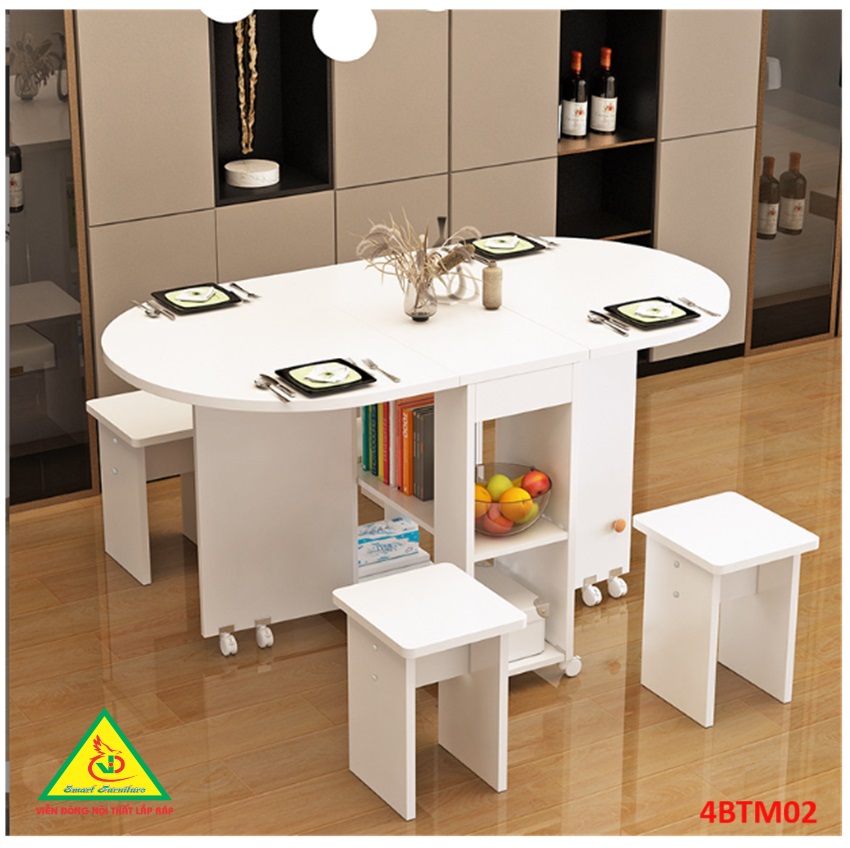 Bàn ăn gấp gọn thông minh Với các gia đình có diện tích phòng ăn không lớn lắm thì Bàn ăn gấp gọn này chính là sự lựa chọn lý tưởng nhất. Bàn ăn có kích thước nhỏ gọn, kết cấu thông minh có thể gấp gọn lại khi không sử dụng tiết kiệm diện tích. Bàn được làm bằng gỗ công nghiệp MDF cao cấp phủ melamine láng mịn, tính thẩm mỹ cao thu hút được sự chú ý của khách hàng. Tích hợp 3 in 1: Bàn, Tủ và Kệ thật Sang - Chảnh - Đẳng Cấp Dù nhà lớn hay nhỏ thì chiếc Bàn Ăn Thông Minh sẽ làm không gian gọn gàng hơn, thoáng hơn và đẹp hơn.