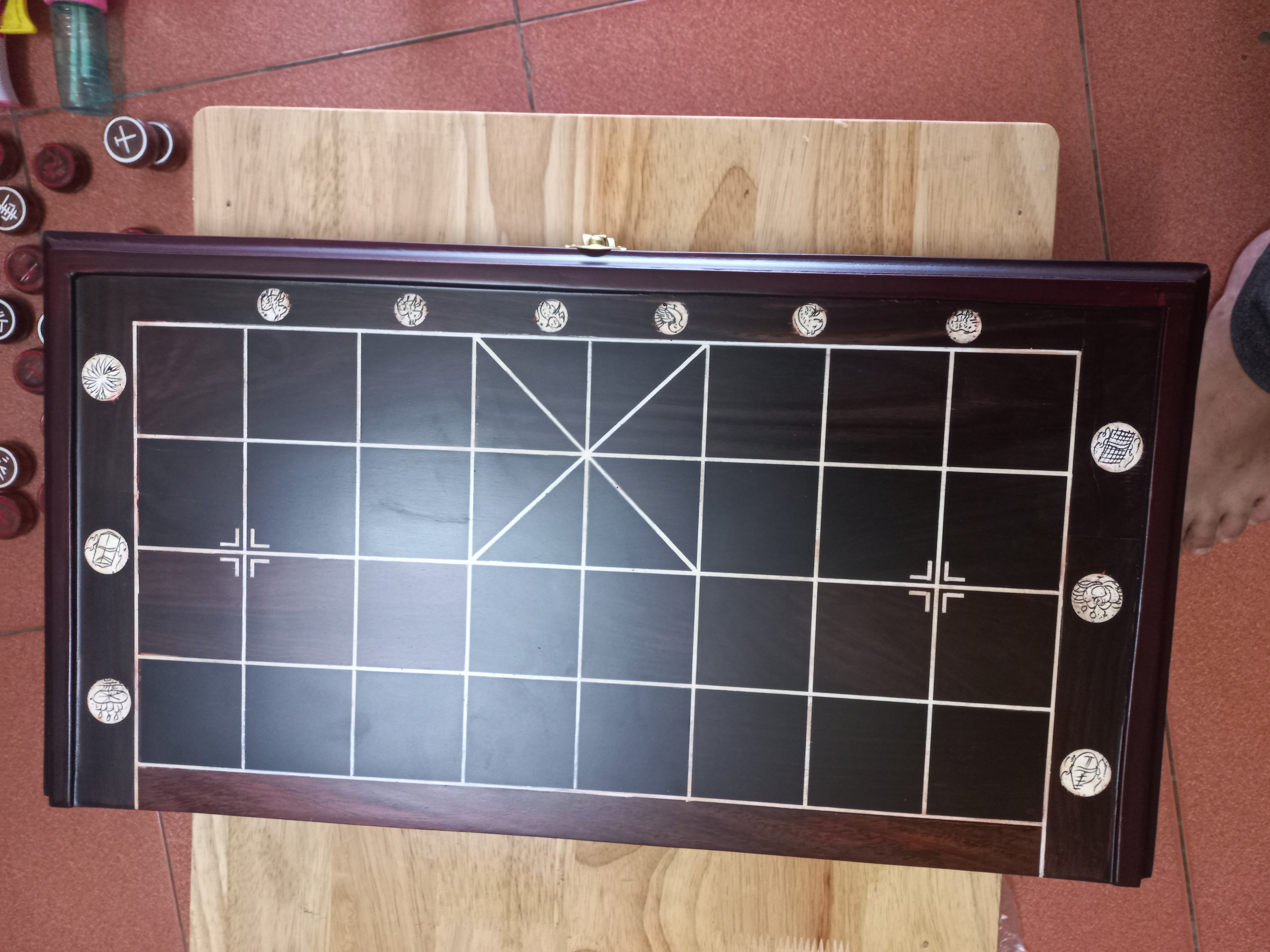 BÀN CỜ TƯỚNG GỖ HƯƠNG GHÉP MẶT VÀ QUÂN CỜ GỖ TRẮC ĐỎ ĐEN GIÀ ĐANH NGUYÊN KHỐI - GIÁ #1000k.