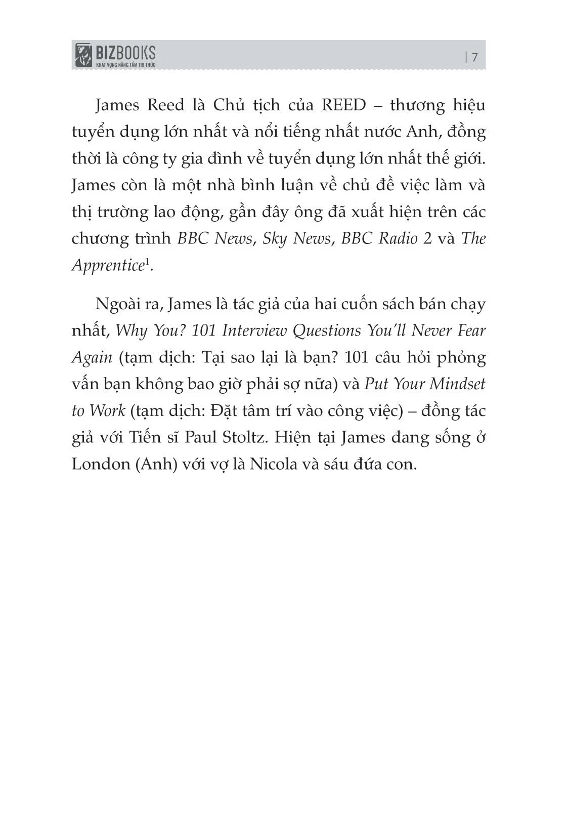 James Reed là Chủ tịch của REED – thương hiệu tuyển dụng lớn nhất và nổi tiếng nhất nước Anh, đồng thời là công ty gia đình về tuyển dụng lớn nhất thế giới. James còn là một nhà bình luận về chủ đề việc làm và thị trường lao động, gần đây ông đã xuất hiện trên các chương trình BBC News, Sky News, BBC Radio 2 và The Apprentice 1. Ngoài ra, James là tác giả của hai cuốn sách bán chạy nhất, Why You? 101 Interview Questions You’ll Never Fear Again (tạm dịch: Tại sao lại là bạn? 101 câu hỏi phỏng vấn bạn không bao giờ phải sợ nữa) và Put Your Mindset to Work (tạm dịch: Đặt tâm trí vào công việc) – đồng tác giả với Tiến sĩ Paul Stoltz.