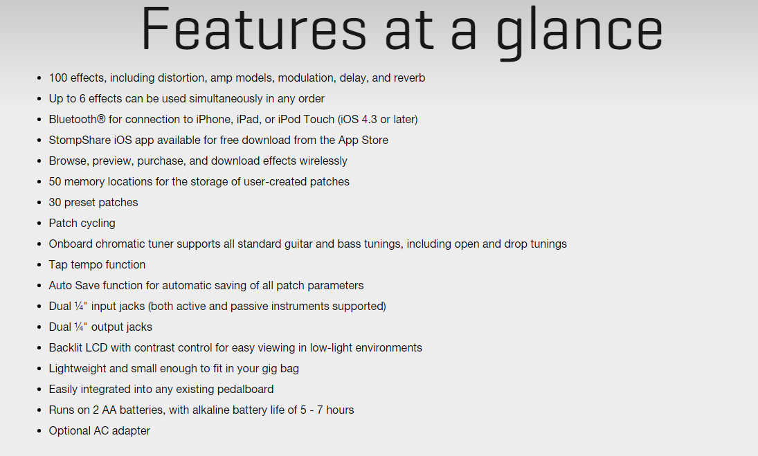 BLUETOOTH STOMPBOX ĐẦU TIÊN THẾ GIỚI MS-100BT Bàn đạp ghi-ta MultiStomp có Bluetooth Hãy tưởng tượng một hộp đàn ghita mạnh mẽ, dễ sử dụng được tải với 100 mẫu amp và hiệu ứng phổ biến nhất trên thế giới. Sau đó, hãy tưởng tượng bạn có thể tải xuống ngay lập tức nhiều hiệu ứng và mô hình khác trực tiếp từ iPhone, iPad hoặc iPod Touch của bạn. Đó là Zoom MS-100BT: Bàn đạp đa hiệu ứng đầu tiên trên thế giới kết hợp công nghệ Bluetooth. Cùng với ứng dụng StompShare miễn phí của Zoom (có sẵn để tải xuống trong Apple App Store), bạn có thể thử, mua và tải xuống các hiệu ứng mới bất kỳ lúc nào bạn cần — vào giữa phiên, trước buổi biểu diễn tiếp theo hoặc chỉ để luyện tập. Với MS-100BT, âm thanh guitar hoàn hảo luôn chỉ cần vuốt nhẹ.       Bluetooth ở khắp mọi nơi. Đó là trong ô tô, trong tai nghe và bộ tai nghe, và trong iPhone, iPad và iPod Touch của bạn. Và bây giờ, với MS-100BT, nó cũng có trong bàn đạp guitar.   Bluetooth là giải pháp không dây tốc độ cao cuối cùng để gửi và nhận dữ liệu. Nó cho phép bạn sử dụng MS-100BT với ứng dụng Zoom's StompShare, một cửa hàng hiệu ứng ảo có sẵn từ Apple App Store để tải xuống miễn phí. Kết nối Bluetooth cũng cho phép bạn cập nhật chương trình cơ sở trong MS-100BT một cách nhanh chóng và dễ dàng.     StompShare: Cửa hàng một cửa cho các hiệu ứng và mô hình amp StompShare cung cấp một loạt các hiệu ứng và mô hình amp hiện đại và cổ điển. Khi bạn đã ở trong cửa hàng StompShare, bạn có thể duyệt xung quanh như thể bạn đang ở trong một cửa hàng thực sự. Bạn có thể nghe các bản trình diễn, đọc mô tả chi tiết về lịch sử của từng hiệu ứng hoặc amp và các thông số có thể chỉnh sửa, thậm chí nhận đề xuất về cách sử dụng hiệu ứng. Nó giống như có người bán hàng thông thái nhất thế giới ngay trong tầm tay bạn!   StompShare cho phép bạn thử các hiệu ứng và mô hình amp trước khi mua, cho phép bạn kiểm tra chúng kỹ lưỡng với thiết lập guitar của riêng bạn và trong không gian quen thuộc của nhà hoặc phòng thu của bạn — điều mà bạn không thể làm ở cửa hàng thực. Trong thời gian dùng thử 15 phút, bạn sẽ có thể điều chỉnh mọi thông số theo ý thích của mình và sử dụng hiệu ứng kết hợp với các hiệu ứng và mô hình amp khác trong MS-100BT của bạn. Khi hoàn tất, bạn có thể cài đặt hiệu ứng vĩnh viễn hoặc chuyển sang khám phá các hiệu ứng và mô hình khác trong cửa hàng.
