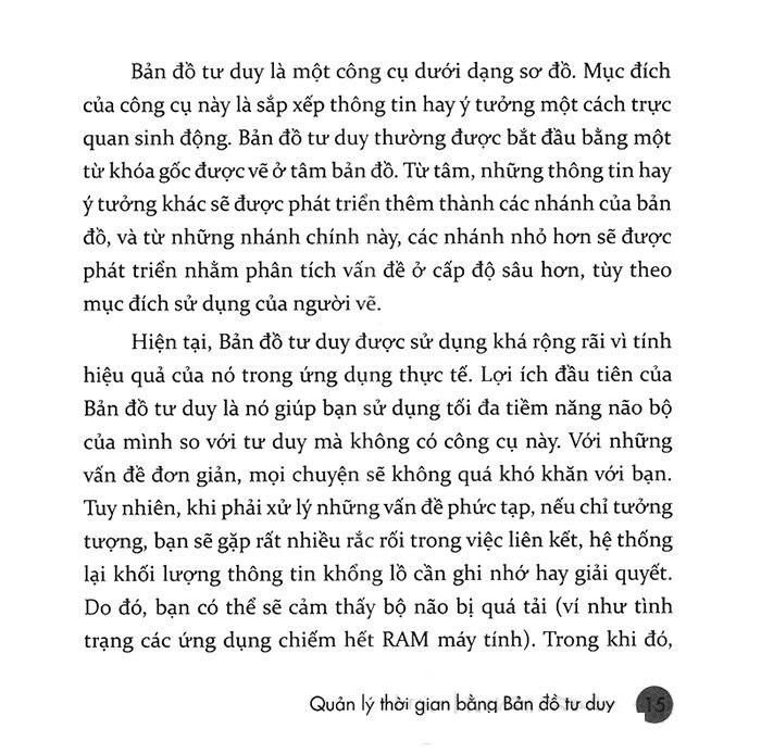 Cuốn sách Bản đồ tư duy trong quản lý thời gian sẽ giới thiệu cho bạn phương pháp quản lý thời gian hiệu quả nhất bằng cách ứng dụng bản đồ tư duy vào phạm trù này. Bạn sẽ biết cách sử dụng thời gian, đặc biệt là thời gian rảnh rỗi một cách tốt nhất cho sự phát triển của bản thân, mà vẫn giữ được sự cân bằng trong cuộc sống, giữa làm việc và thư giãn, đặc biệt là trị được căn bệnh lười biếng, không có mục tiêu của mình để trở thành người hạnh phúc hơn và thành công hơn trong cuộc sống.