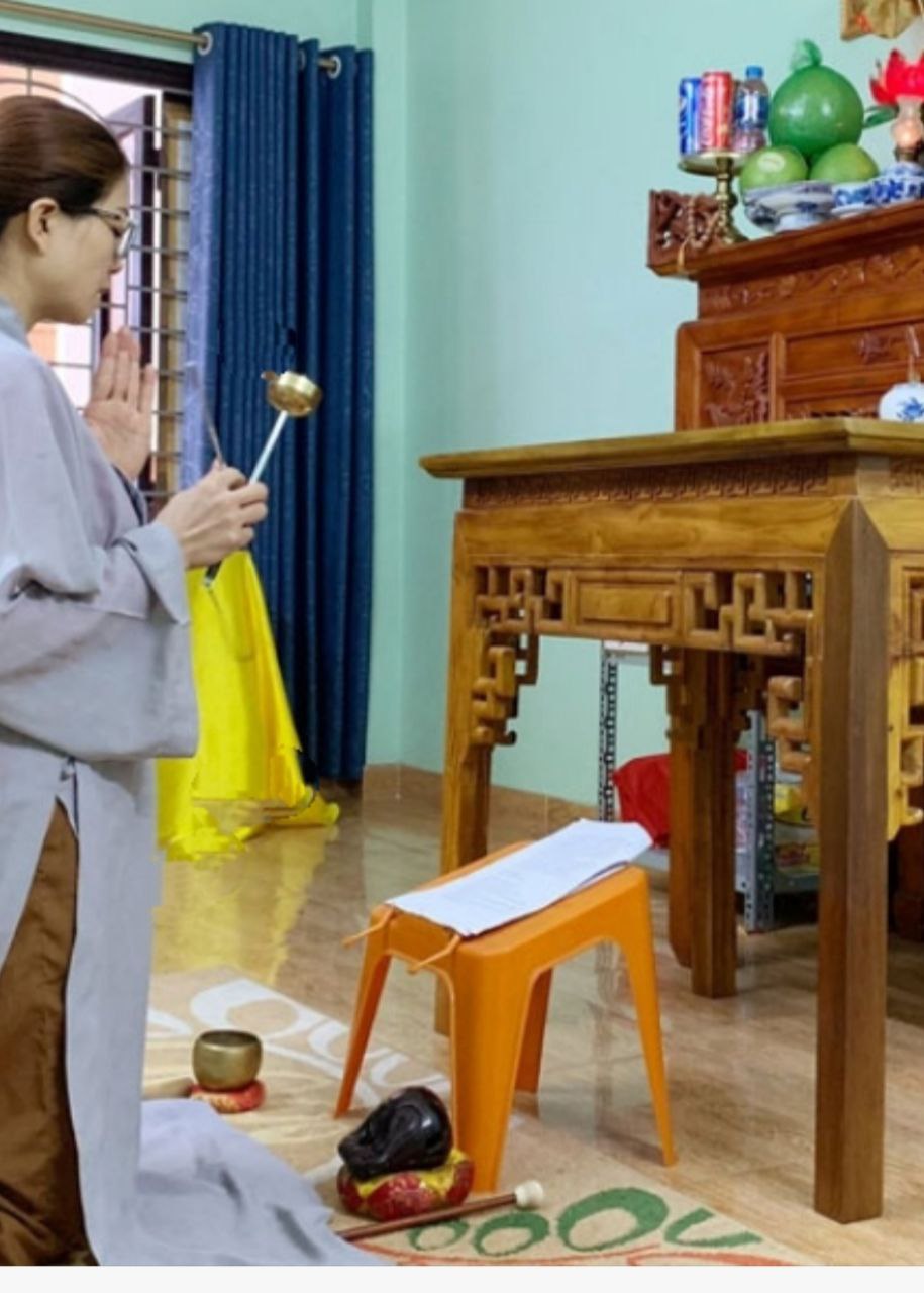 Điểm nhấn nổi bật là tòa sen trang trí tinh tế cùng dòng chữ “Nam Mô A Di Đà Phật” in nổi đầy tôn kính, tạo nên không gian tu tập linh thiêng và thanh tịnh.
