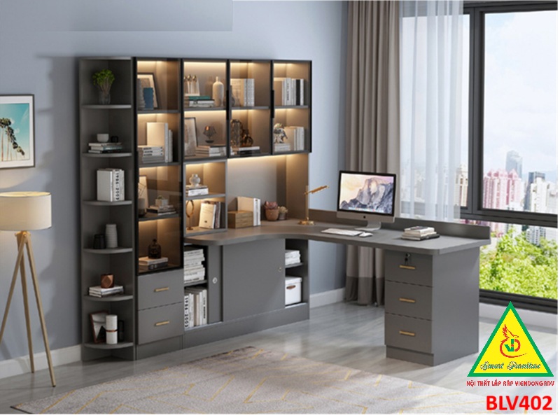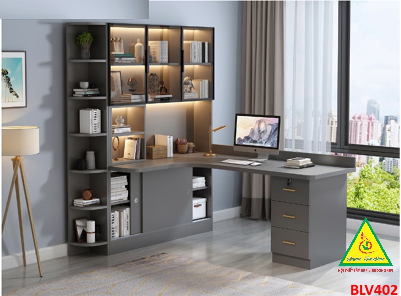 Bàn liền kệ kết hợp tủ trưng bày: Tận dụng không gian hiệu quả, tích hợp kệ sách, kệ tài liệu và tủ cánh kính trưng bày đồ decor, huy chương, mô hình, nước hoa...