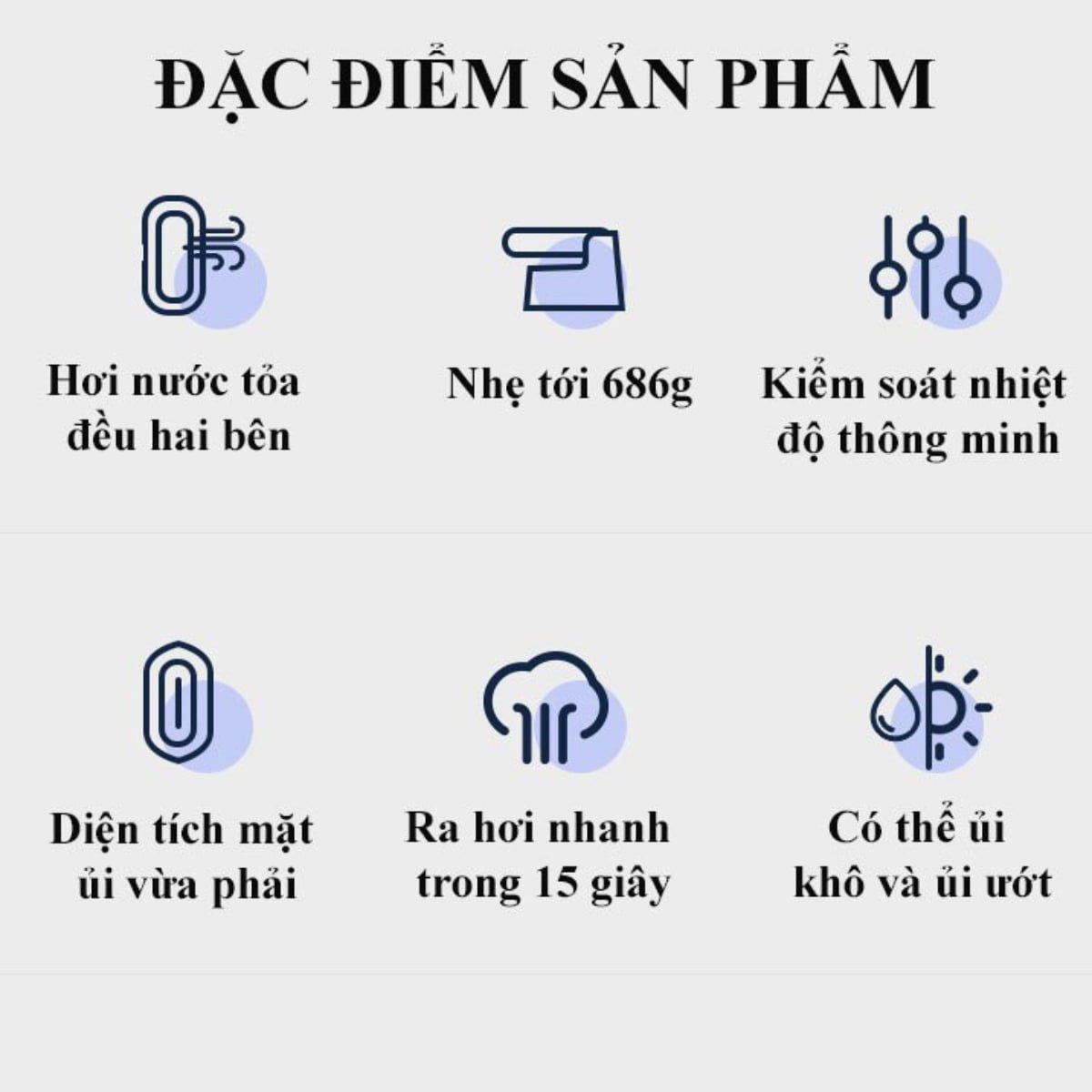 • Thiết kế nhỏ gọn có thể dễ dàng mang theo đi du lịch • Độ hoàn thiện sắc sảo • Luồng hơi nước mạnh mẽ, làm phẳng mọi nếp nhắn hiệu quả • Nước