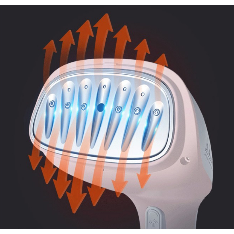 Diện tích bàn ủi cầm tay được mở rộng với 7 lỗ phun hơi nước cải tiến, giúp tiếp xúc được nhiều hơn diện tích mặt vải, rút ngắn thời gian ủi
