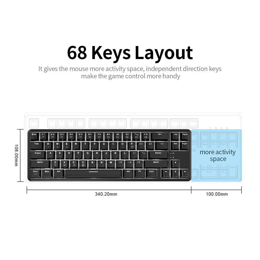 Features: N-key Rollover. 68 Keys design, with compact layout, and the N-key Rollover technique makes you stand out when playing games, and brings better gaming experience. ABS Floating Keycaps. Adopts the floating keycaps that are