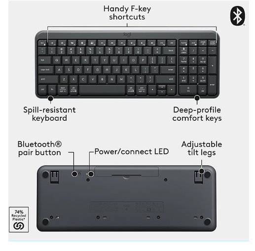 Gõ phím dễ dàng với bàn phím logitech không dây Bluetooth K251, một bàn phím đơn giản, đầy đủ tính năng, không dây và bền bỉ với các bộ phận bằng nhựa sử dụng tối thiểu 64% vật liệu tái chế.