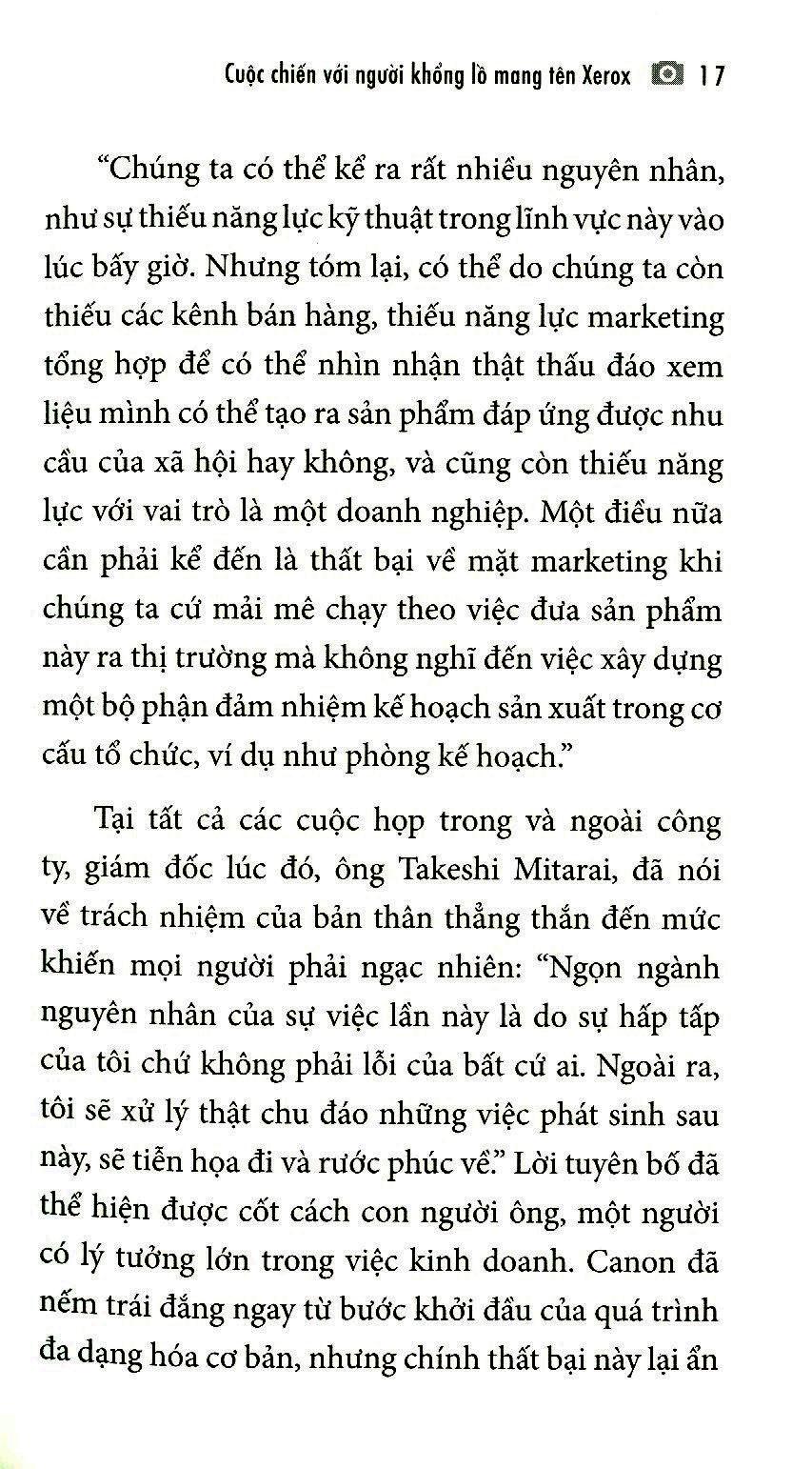 Tại tất cả các cuộc họp trong và ngoài công ty, giám đốc lúc đó, ông Takeshi Mitarai, đã nói về trách nhiệm của bản thân thẳng thắn đến mức khiến mọi người phải ngạc nhiên: “Ngọn ngành nguyên nhân của sự việc lần này là do sự hấp tấp của tôi chứ không phải lỗi của bất cứ ai. Ngoài ra, tôi sẽ xử lý thật chu đáo những việc phát sinh sau này, sẽ tiễn họa đi và rước phúc về.” Lời tuyên bố đã thể hiện được cốt cách con người ông, một người có lý tưởng lớn trong việc kinh doanh. Canon đã nếm trái đắng ngay từ bước khởi đầu của quá trình đa dạng hóa cơ bản, nhưng chính thất bại này lại ẩn giấu tiềm năng phát triển về sau.