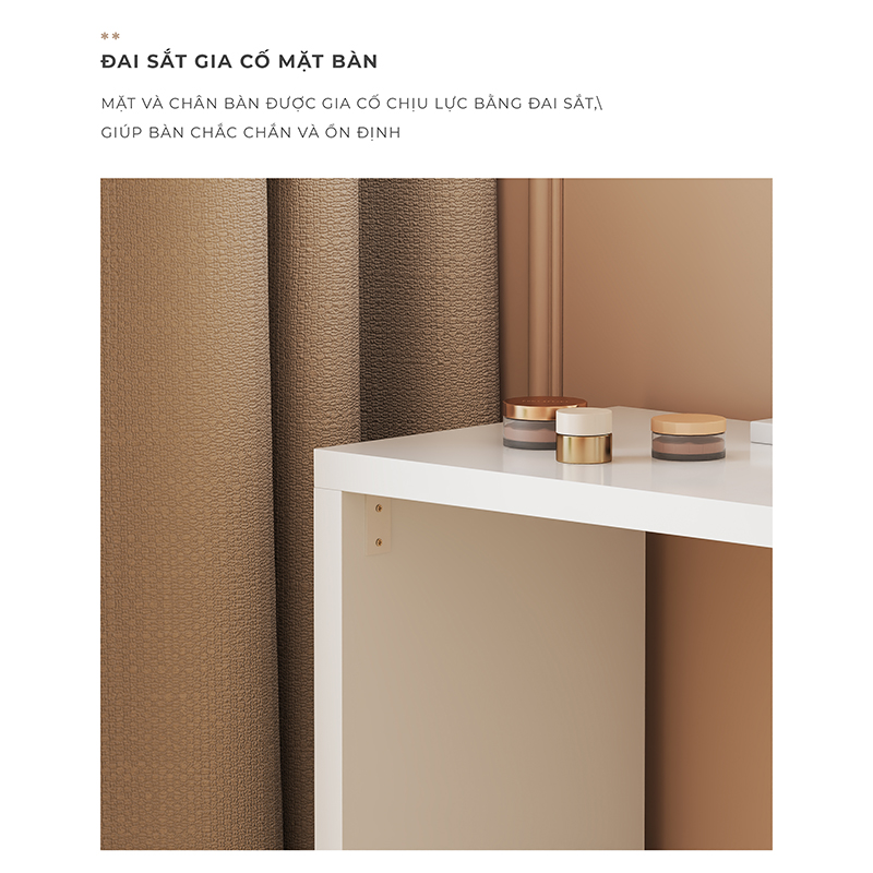 THÔNG TIN SẢN PHẨM - Kích thước bàn: Dài 60cm, Rộng 30cm, Cao 44cm - Chất liệu: Mặt bàn gỗ MDF phủ melamin chống xước - Màu sắc: Trắng - Công năng: Bàn trang điểm