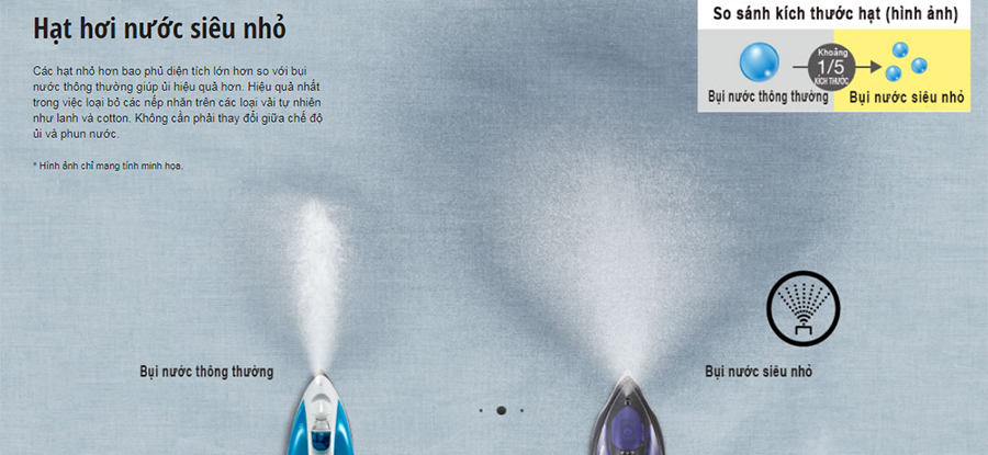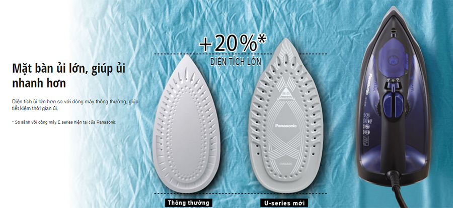 Ngoài ra, bản ủi Panasonic thích hợp với mọi loại vải, có vòng chỉnh nhiệt giúp lựa chọn được mức nhiệt độ phù hợp cho từng loại vải, đèn báo sẽ tự tắt khi đạt mức nhiệt cần thiết, bảo vệ quần áo không bị cháy xém do gặp phải nhiệt độ quá cao. Nổi bật hơn là có cấu tạo các hạt hơi nước siêu nhỏ bao phủ diện tích tích lớn, hiệu quả trong việc loại bỏ các nếp nhăn trên các loại vải tự nhiên như lanh và cotton, không cần phải thay đổi giữa chế độ ủi và phun nước.