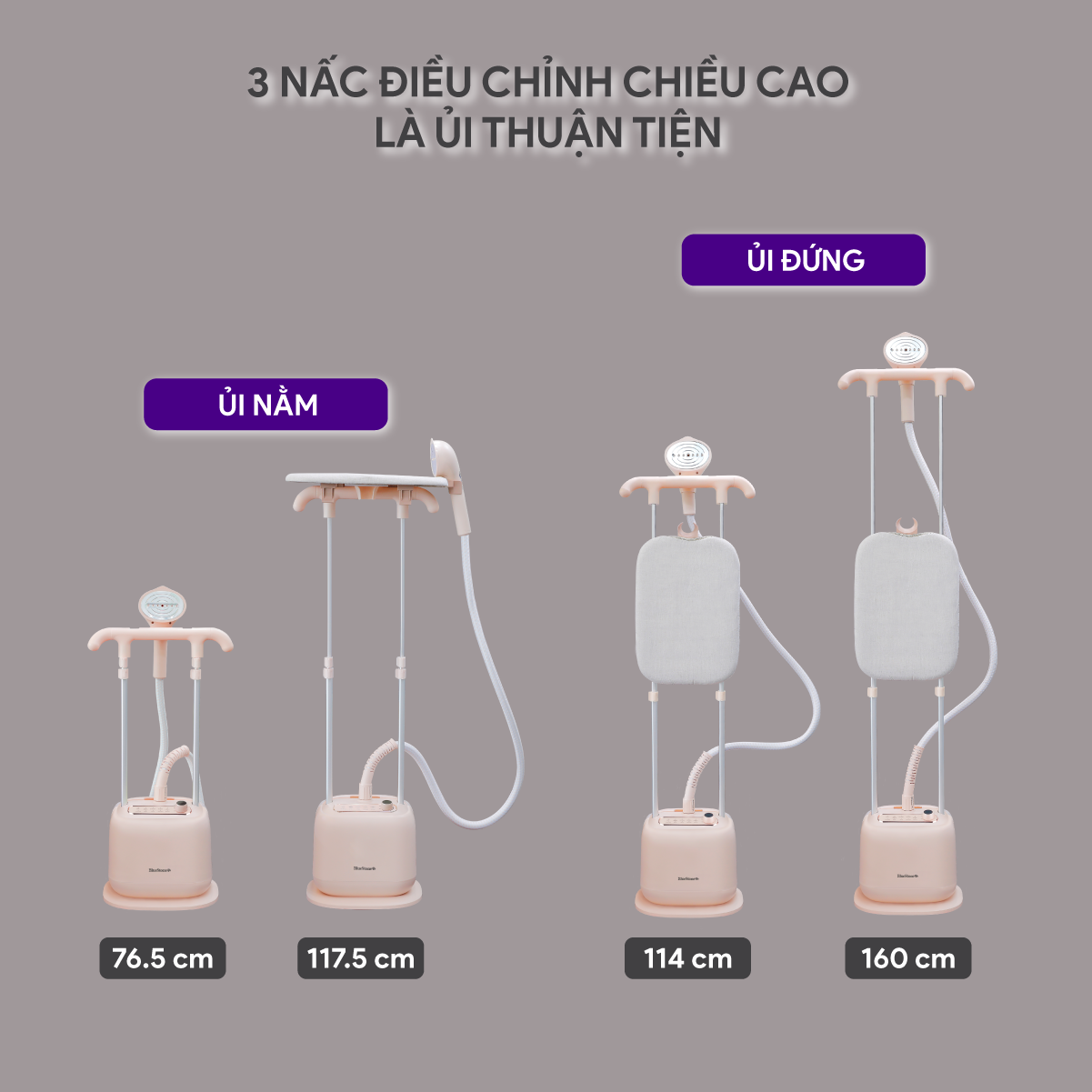 Đặc điểm nổi bật Thiết kế bàn ủi đứng hiện đại, dễ dàng di chuyển với bánh xe đi kèm Công suất 1800W làm nóng nhanh, tiết kiệm thời gian ủi Móc áo trên cùng có thể thu