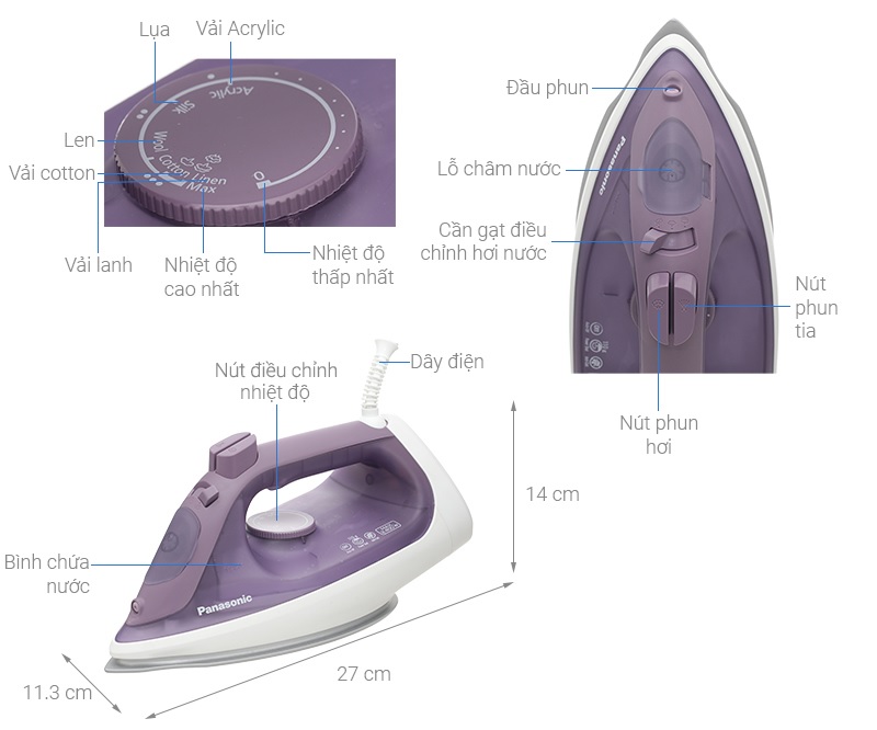 Bàn ủi hơi nước Panasonic NI-S430GRA có mặt đế Silver Titan chống dính trượt êm nhẹ trên bề mặt quần áo, ủi thẳng các nếp nhăn nhanh với công suất 2300W, ủi được nhiều quần áo với dung tích bình chứa 300 ml, có nhiều chức năng ủi đáp ứng tốt nhu cầu sử dụng trong gia đình. Thiết kế của sản phẩm - Bàn ủi Panasonic thiết kế tối giản, tông màu trẻ trung, chỉ nặng 1.1 kg kết hợp với tay cầm vừa vặn cho bạn cầm nắm và di chuyển bàn ủi linh hoạt. - Đế tựa kích thước hợp lý cho bạn dựng đứng bàn ủi dễ dàng, ổn định, hạn chế ngã, đổ. Mặt đế - Thiết kế mặt đế Silver Titan chống dính lướt mượt mà trên tất cả các chất liệu vải, hạn chế trầy xước, dễ dàng làm sạch. - Mặt đế hình chữ U cho bạn thay đổi hướng ủi dễ dàng, thuận tay. Công suất và dung tích bình chứa - Bàn ủi hơi nước có công suất hoạt động lên đến 2300W giúp làm nóng bàn ủi trong thời gian ngắn, phun hơi mạnh mẽ, đồng đều, ủi thẳng các nếp nhăn dễ dàng. - Bình chứa nước dung tích 300 ml ủi được tầm 4 - 5 bộ quần áo trong một lần ủi, nên sử dụng nước sạch, không dùng nước xả quần áo, nước hoa. Bảng điều khiển - Trang bị bảng điều khiển nút xoay, nút nhấn và nút gạt cho bạn tùy chỉnh các chức năng ủi, nhiệt độ ủi thuận tiện. - Có nhiều chức năng ủi: phun hơi, phun tia, ủi khô và ủi hơi nước. Tiện ích - Hỗ trợ tính năng chống nhỏ giọt giảm khả năng bị rò rỉ nước khi cài đặt ở nhiệt độ thấp, tăng cường độ bền cho thiết bị và đảm bảo an toàn cho người dùng. - Hệ thống chống đóng cặn hạn chế tình trạng tắc nghẽn lỗ thoát hơi nước, giúp nước phun ra trong sạch, ủi đồ bền đẹp dài lâu. - Thiết kế mũi nhọn, rãnh cúc tiện lợi giúp chị em len lỏi bàn ủi vào các khu vực nhỏ, hẹp như nách áo, cổ áo, hàng cúc áo,... dễ dàng. - Không xoắn dây với thiết kế dây nguồn xoay 360 độ, thao tác bàn ủi không sợ vướng víu. Lưu ý khi sử dụng - Không bao giờ đổ chất tẩy vào bên trong bàn ủi vì có thể làm hỏng các bộ phận chức năng sản phẩm. - Luôn đặt bàn ủi đứng trên đế để bảo vệ lớp chống dính của mặt đế không bị xước, mòn, dính bẩn. - Trong khi sử dụng, các lần nhấn nút tia nước nên cách nhau khoảng 2 giây để không tạo ra vệt nước trên quần áo. - Chỉ nên sử dụng bàn ủi với mục đích ủi vải, không dùng cho mục đích khác. - Khi ủi quần áo ướt nên dùng chức năng ủi khô vì có thể gây phỏng do nước nóng bắn ra từ thân bàn ủi chính. Bàn ủi hơi nước Panasonic NI-S430GRA 2300W thiết kế gọn gàng, mặt đế Silver Titan chống dính độ bền cao, dễ làm sạch, ủi đồ nhanh chóng với công suất lớn, dung tích bình chứa 300 ml ủi được nhiều bộ quần áo, sử dụng bền bỉ, an toàn với hệ thống chống đóng cặn, chống nhỏ giọt.