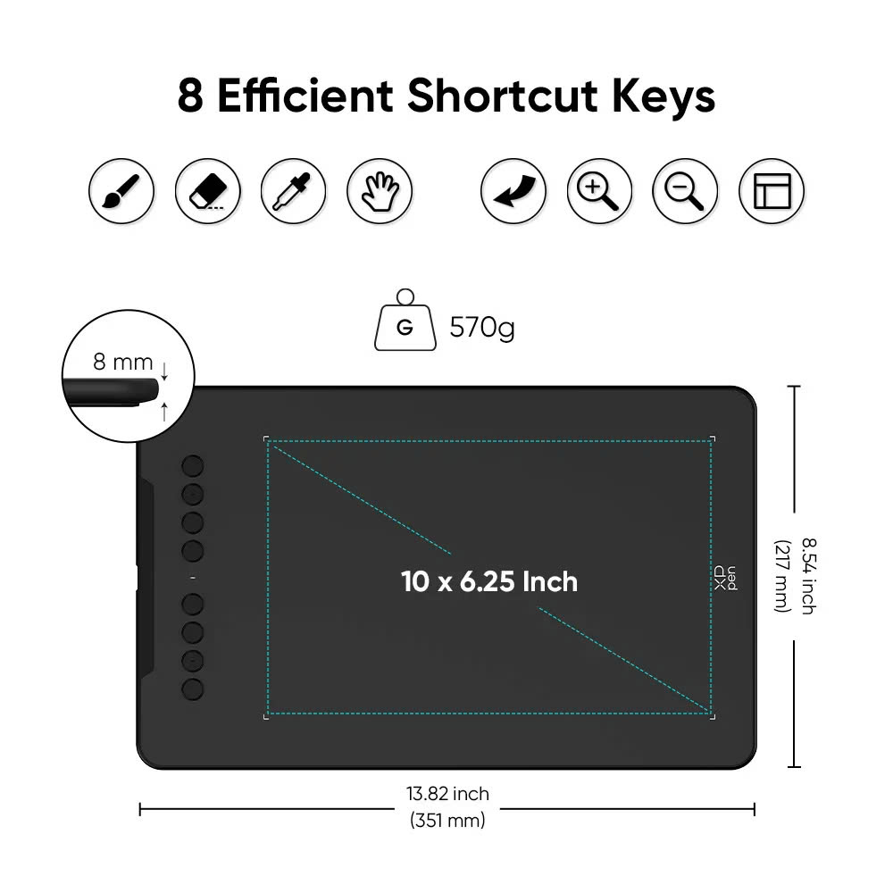 Bảng vẽ Deco 01 V3 sở hữu kích thước ấn tượng với vùng hoạt động 10 x 6,25 inch. Cho bạn không gian làm việc rộng rãi để thỏa sức sáng tạo. Với trọng lượng nhẹ và độ dày chỉ 8 mm, nó cho phép bạn mang theo bên mình đến bất cứ nơi đâu.