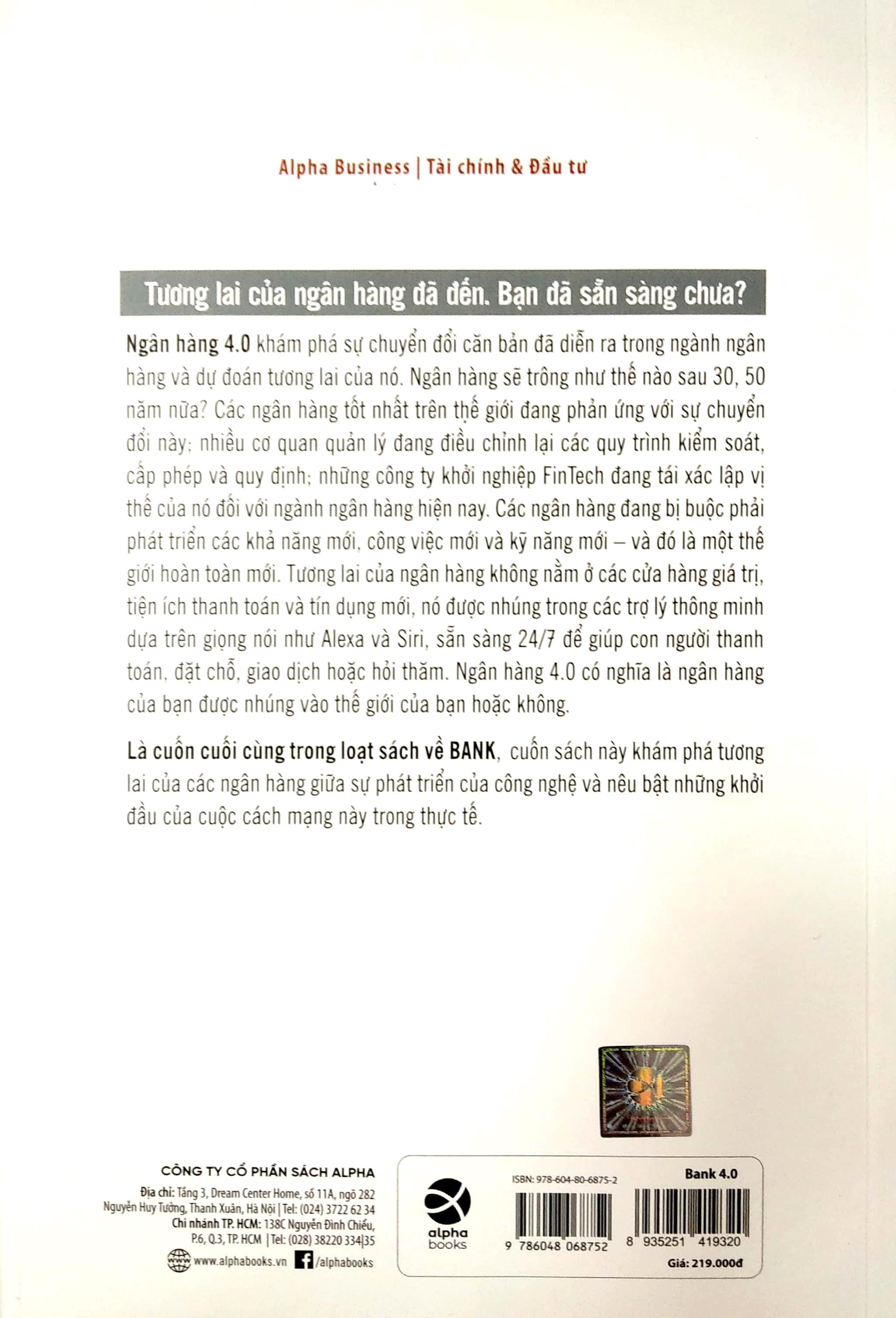 Cuốn sách là phần cuối cùng trong loạt sách về ngân hàng, cuốn sách Bank 4.0 khám phá tương lai của các ngân hàng giữa sự phát triển của công nghệ và nêu bật những khởi đầu của cuộc cách mạng này trong thực tế.
