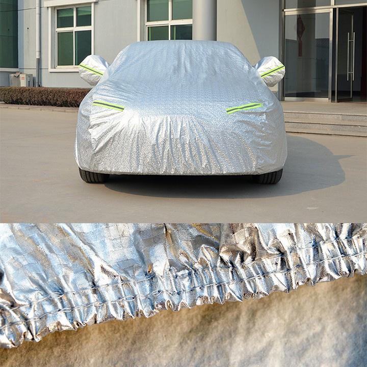 - Bạt phủ xe có mặt ngoài là chất liệu vải PEVA tráng nhôm phản quang, cách nhiệt, chống thấm, dai và chắc chắn giúp chống nắng, chống thấm nước, chống bám bụi hiệu quả.