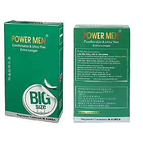 Bao cao su cỡ lớn chống xuất tinh sớm Power Men Comfortable Ultrathin Extra Longer dành cho các quý ông “ngoại cỡ”, truyền nhiệt tốt mang lại cảm xúc chân thật, 100% chất liệu cao su thiên nhiên, không kích ứng. Nhiều gel bôi trơn, chứa 5% Benzocain giúp kéo dài thời gian cuộc yêu, khẳng định bản lĩnh của chàng. Giúp hỗ trợ độ ẩm tự nhiên cho ad phụ nữ và tình trạng đau rát khi “lâm trận”