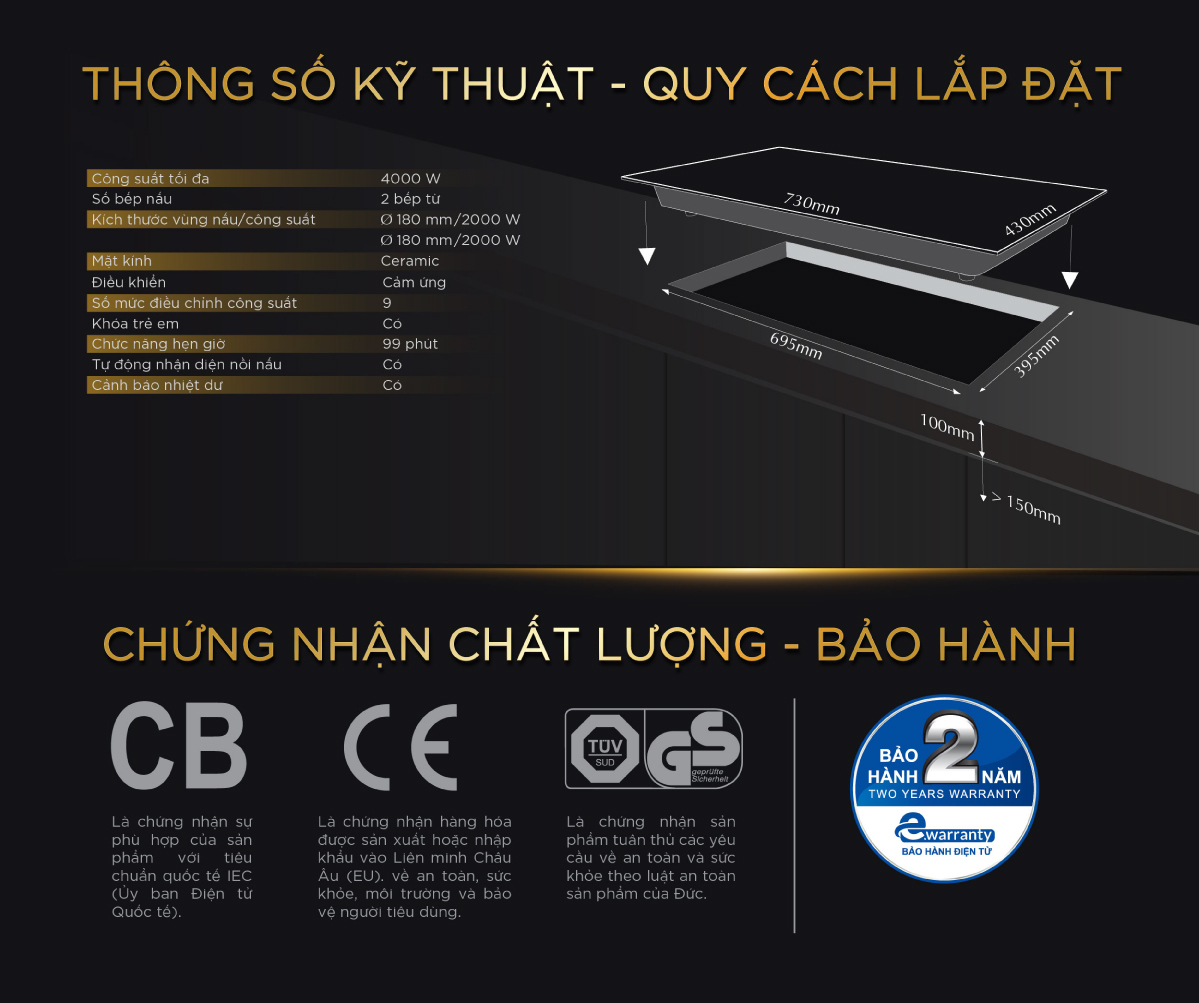 THÔNG SỐ KỸ THUẬT: – Điện áp 220V/50Hz – Trái 2000W/Booster 2300W – Phải 2000W/Booster 2300W – Kích thước (dài x rộng x cao): 750x430x60mm – Kích thước khoét lỗ: 695x395mm TÍNH NĂNG SẢN PHẨM: