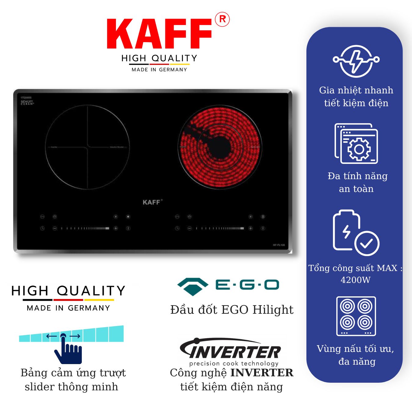 Mua tại TiktokBẾP ĐIỆN TỪ KẾT HỢP KAFF KF-FL108 MADE IN GERMANY KAFF Official sẽ mang đến cho gia đình bạn một gian bếp đẳng cấp với sản phẩm Bếp điện từ đôi kết hợp KF-FL108 sở hữu thiết kế sang trọng, hiện đại mang đến cho gia đình bạn một gian bếp đẳng cấp. Mặt kính SCHOTT CE.RAN chịu nhiệt, chịu lực siêu việt, bảng điều khiển cảm ứng trượt hiện đại, phù hợp với mọi loại nồi chảo, tích hợp các tính năng khóa trẻ em, tự động ngắt điện khi quá nhiệt giúp tiết kiệm điện năng, nhanh chóng và đảm bảo an toàn tối đa. Bếp còn được trang bị thiết bị gia nhiệt EGO uy tín giúp gia nhiệt tốt hơn.