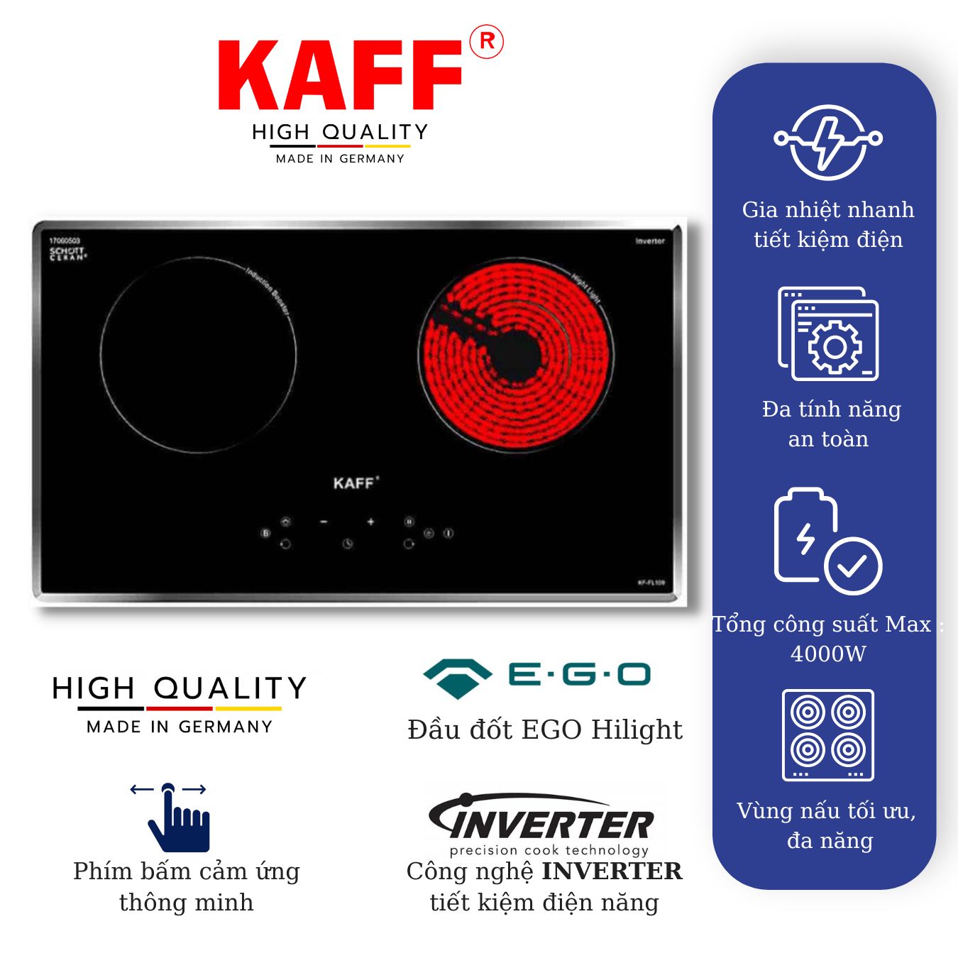 Mua tại TiktokBẾP ĐIỆN TỪ KẾT HỢP KAFF KF - FL109 MADE IN GERMANY KAFF Official sẽ mang đến cho gia đình bạn một gian bếp đẳng cấp với sản phẩm Bếp điện từ đôi kết hợp KF-FL109 sở hữu thiết kế sang trọng, hiện đại mang đến cho gia đình bạn một gian bếp đẳng cấp. Mặt kính SCHOTT CE.RAN chịu nhiệt, chịu lực siêu việt, bảng điều khiển cảm ứng trượt hiện đại, phù hợp với mọi loại nồi chảo, tích hợp các tính năng khóa trẻ em, tự động ngắt điện khi quá nhiệt giúp tiết kiệm điện năng, nhanh chóng và đảm bảo an toàn tối đa. Bếp còn được trang bị thiết bị gia nhiệt EGO uy tín giúp gia nhiệt tốt hơn.