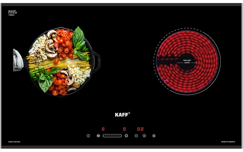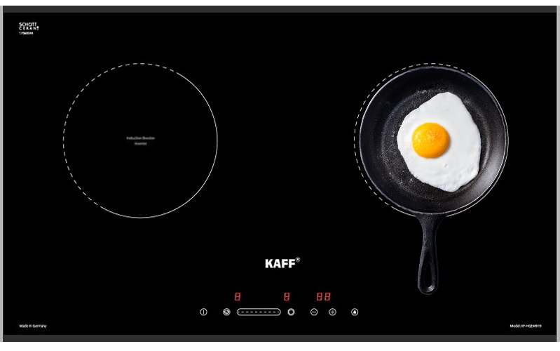 BẾP ĐIỆN TỪ KAFF KF-EG900IH | NHẬP KHẨU NGUYÊN CHIẾC TỪ CHLB ĐỨC | THIẾT KẾ SANG TRỌNG | HỆ ĐIỀU KHIỂN CẢM ỨNG SLIDER CONTROL LINH HOẠT | AN TOÀN, BỀN BỈ VÀ TIẾT KIỆM ĐIỆN NĂNG   Bếp điện từ Kaff KF-EG900IH sử dụng mặt kính Schott Ceran sản xuất tại Đức, mặt kính được làm từ chất liệu gốm thủy tinh có khả năng chịu nhiệt lên đến 1000°C, kháng sốc 750°C. Bề mặt kính chịu nóng lạnh cũng như sự thay đổi đột ngột của nhiệt độ. Độ giãn nở vì nhiệt thấp nên bếp hoạt động rất hiệu quả và cách nhiệt. Mặt bếp tản nhiệt nhanh và được cách điện an toàn với các linh kiện điện tử bên trong thân. Bạn có thể yên tâm sử dụng mà không lo bị bỏng hay điện giật.   Đây là mặt kính chuyên dụng dành cho bếp điện từ, là một loại kính có chất lượng cao, rất cứng, bền và có nhiều đặc điểm nổi trội như: khả năng chịu nhiệt, khả năng chống trầy xước và chống va đập Mặt kính gồm các thấu kính hội tụ, truyền nhiệt từ bếp lên đáy nồi theo phương thẳng đứng, không thất thoát nhiệt ra môi trường. Mặt kính màu xám liền nguyên khối, an toàn, thẩm mỹ và tiện trong việc vệ sinh, lau chùi.   Bếp điện từ Kaff KF-EG900IH gồm 2 vùng nấu với tổng công suất 4000W, vùng nấu từ trái có công suất 1800W khi kích hoạt tính năng nấu nhanh Booster công suất lên tới 3500W, vùng nấu hồng ngoại phải sử dụng mâm nhiệt E.G.O Hi-Light với 02 vòng nhiệt có công suất tối đa 2200W. Chỉ trong chốc lát sau khi kích hoạt tính năng này, nhiệt lượng trên vùng nấu từ tăng lên công suất tương đương với mức nhiệt lượng lớn nhất. Do đó, các món ăn được nấu chín nhanh hơn, tiết kiệm thời gian vào bếp cho chị em nội trợ. Chức năng Booster nấu siêu nhanh, tuy nhiên thời gian tối đa mặc định dùng chức năng này là 10 phút / lần tránh quá tải.   Bếp điện từ Kaff KF-EG900IH với công nghệ Inverter thông minh vượt trội giúp làm giảm lượng tiêu thụ điện của các sản phẩm có sử dụng lõi từ của bếp từ. Ngoài ra công nghệ Inverter còn giúp bếp từ điều chỉnh mức công suất phù hợp để không làm tiêu thụ nhiều điện năng. Bếp điện từ Kaff KF-EG900IH với cảm biến thông minh sẽ cố định công suất tiêu thụ điện khi đun nấu, không bật tắt liên tục như các bếp từ thông thường khác (tự động điều chỉnh liên tục để đảm bảo mức nhiệt tương đương bằng với con số hiển thị trên bàn điều khiển).   Bạn có thể tận dụng các loại xoong, nồi vì bếp điện không kén nồi, phù hợp với nhiều kích cỡ. Ưu điểm của bếp điện hơn hẳn các sản phẩm khác là có thể nướng trực tiếp lên bề mặt. Nướng thịt, rau củ, hải sản thơm ngon. Bạn nên vệ sinh sạch sẽ mặt bếp sau khi sử dụng. Hoạt động của bếp điện là truyền nhiệt lên mặt kính rồi mới lên đáy nồi nên mặt kính bếp rất nóng. Sau khi nấu, bạn có thể tận dụng hâm nóng thức ăn trên bếp. Ngược lại với vùng điện, bếp từ chỉ hơi nóng vùng nấu. Hiệu suất nấu lên tới 90%. Chức năng nhận diện vùng nấu chỉ sinh nhiệt vùng đáy nồi, tránh nồi thất thoát nhiệt ra ngoài.   Bếp điện từ Kaff KF-EG900IH được tích hợp chức năng tự nhận diện vùng nấu, khi ta đặt nồi lên 1 trong 2 vùng nấu sau đó ấn nút khởi động bếp sau thời gian 1-2 giây bếp sẽ tự động tìm vùng nấu đã có nồi, ta chỉ việc điều chỉnh mức công suất to nhỏ theo ý muốn mà không phải thao tác chọn vùng nấu như bếp thông thường. Công nghệ Inverter được áp dụng trên Bếp điện từ Kaff KF-EG900IHcó khả năng phản ứng thay đổi công suất theo điều khiển ngay tức thì, khi người dùng điều chỉnh tăng giảm nhiệt độ đun nấu, bếp điều chỉnh thay đổi tức thì về mức nhiệt độ mong muốn.   Bếp điện từ Kaff KF-EG900IH sử dụng bảng điều khiển cảm ứng dạng trượt Slider Control hiện đại với 9 cấp độ công suất nhiệt độ khác nhau, điều khiển dễ dàng bằng một ngón tay, mọi chương trình nấu đều được hiển thị qua đèn Led sắc nét để bạn điều chỉnh cho phù hợp với các món ăn. Bếp còn được trang bị thêm các chức năng nấu thông minh là: tính năng tạm dừng và hâm nóng.   Chức năng tạm dừng và ghi nhớ chương trình Pause & Recall: Tạm dừng bếp khi đang đun nấu, sau đó ta tiếp tục đun nấu trở lại bằng việc nhấn vào thanh trượt Slider hoặc phím Pause, bếp sẽ hoạt động trở lại đúng cài đặt trước đó khi được khởi chạy trở lại.   Chức năng ủ ấm “hâm nóng”: Với công nghệ biến tần Inverter vượt trội, Bếp điện từ Kaff KF-EG900IH có khả năng ủ ấm ở nhiệt độ nhất định, chức năng ủ ấm được lập trình giữ mức nhiệt độ ổn định giúp chúng ta duy trì nhiệt cho thức ăn luôn nóng mà không bị nguội đi phải đun lại nhiều lần làm giảm chất dinh dưỡng trong thức ăn, đặc biệt về mùa đông thời tiết lạnh.   Phần thân vỏ của v sử dụng chất liệu thép chống rỉ. Đây là chất liệu có khả nă