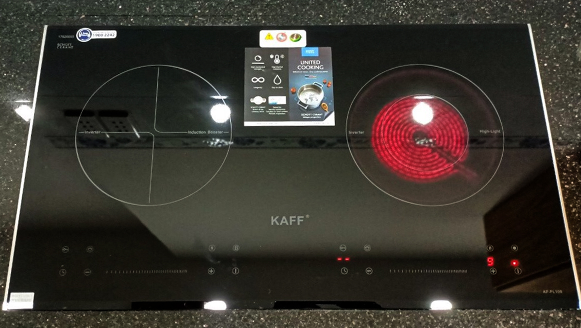 BẾP ĐIỆN TỪ KAFF KF-FL108 | NHẬP KHẨU NGUYÊN CHIẾC TỪ CHLB ĐỨC | THIẾT KẾ SANG TRỌNG | HỆ ĐIỀU KHIỂN CẢM ỨNG SLIDER CONTROL LINH HOẠT | AN TOÀN, BỀN BỈ VÀ TIẾT KIỆM ĐIỆN NĂNG   Bếp điện từ Kaff KF-FL108 sử dụng mặt kính Schott Ceran sản xuất tại Đức, mặt kính được làm từ chất liệu gốm thủy tinh có khả năng chịu nhiệt lên đến 1000°C, kháng sốc 750°C. Bề mặt kính chịu nóng lạnh cũng như sự thay đổi đột ngột của nhiệt độ. Độ giãn nở vì nhiệt thấp nên bếp hoạt động rất hiệu quả và cách nhiệt. Mặt bếp tản nhiệt nhanh và được cách điện an toàn với các linh kiện điện tử bên trong thân. Bạn có thể yên tâm sử dụng mà không lo bị bỏng hay điện giật.   Đây là mặt kính chuyên dụng dành cho bếp điện từ, là một loại kính có chất lượng cao, rất cứng, bền và có nhiều đặc điểm nổi trội như: khả năng chịu nhiệt, khả năng chống trầy xước và chống va đập Mặt kính gồm các thấu kính hội tụ, truyền nhiệt từ bếp lên đáy nồi theo phương thẳng đứng, không thất thoát nhiệt ra môi trường. Mặt kính màu xám liền nguyên khối, an toàn, thẩm mỹ và tiện trong việc vệ sinh, lau chùi.   Bếp điện từ Kaff KF-FL108 gồm 2 vùng nấu với tổng công suất 4200W, vùng nấu từ trái có công suất 2200W khi kích hoạt tính năng nấu nhanh Booster công suất lên tới 3500W, vùng nấu hồng ngoại phải sử dụng mâm nhiệt E.G.O Hi-Light với 02 vòng nhiệt có công suất tối đa 2000W. Chỉ trong chốc lát sau khi kích hoạt tính năng này, nhiệt lượng trên vùng nấu từ tăng lên công suất tương đương với mức nhiệt lượng lớn nhất. Do đó, các món ăn được nấu chín nhanh hơn, tiết kiệm thời gian vào bếp cho chị em nội trợ. Chức năng Booster nấu siêu nhanh, tuy nhiên thời gian tối đa mặc định dùng chức năng này là 10 phút / lần tránh quá tải.   Bếp điện từ Kaff KF-FL108 với công nghệ Inverter thông minh vượt trội giúp làm giảm lượng tiêu thụ điện của các sản phẩm có sử dụng lõi từ của bếp từ. Ngoài ra công nghệ Inverter còn giúp bếp từ điều chỉnh mức công suất phù hợp để không làm tiêu thụ nhiều điện năng. Bếp điện từ Kaff KF-FL108 với cảm biến thông minh sẽ cố định công suất tiêu thụ điện khi đun nấu, không bật tắt liên tục như các bếp từ thông thường khác (tự động điều chỉnh liên tục để đảm bảo mức nhiệt tương đương bằng với con số hiển thị trên bàn điều khiển).   Bạn có thể tận dụng các loại xoong, nồi vì bếp điện không kén nồi, phù hợp với nhiều kích cỡ. Ưu điểm của bếp điện hơn hẳn các sản phẩm khác là có thể nướng trực tiếp lên bề mặt. Nướng thịt, rau củ, hải sản thơm ngon. Bạn nên vệ sinh sạch sẽ mặt bếp sau khi sử dụng. Hoạt động của bếp điện là truyền nhiệt lên mặt kính rồi mới lên đáy nồi nên mặt kính bếp rất nóng. Sau khi nấu, bạn có thể tận dụng hâm nóng thức ăn trên bếp. Ngược lại với vùng điện, bếp từ chỉ hơi nóng vùng nấu. Hiệu suất nấu lên tới 90%. Chức năng nhận diện vùng nấu chỉ sinh nhiệt vùng đáy nồi, tránh nồi thất thoát nhiệt ra ngoài.   Bếp điện từ Kaff KF-FL108 được tích hợp chức năng tự nhận diện vùng nấu, khi ta đặt nồi lên 1 trong 2 vùng nấu sau đó ấn nút khởi động bếp sau thời gian 1-2 giây bếp sẽ tự động tìm vùng nấu đã có nồi, ta chỉ việc điều chỉnh mức công suất to nhỏ theo ý muốn mà không phải thao tác chọn vùng nấu như bếp thông thường. Công nghệ Inverter được áp dụng trên Bếp điện từ Kaff KF-FL108 có khả năng phản ứng thay đổi công suất theo điều khiển ngay tức thì, khi người dùng điều chỉnh tăng giảm nhiệt độ đun nấu, bếp điều chỉnh thay đổi tức thì về mức nhiệt độ mong muốn.   Bếp điện từ Kaff KF-FL108 sử dụng bảng điều khiển cảm ứng dạng trượt Slider Control hiện đại với 9 cấp độ công suất nhiệt độ khác nhau, điều khiển dễ dàng bằng một ngón tay, mọi chương trình nấu đều được hiển thị qua đèn Led sắc nét để bạn điều chỉnh cho phù hợp với các món ăn. Bếp còn được trang bị thêm các chức năng nấu thông minh là: tính năng tạm dừng và hâm nóng.   Chức năng tạm dừng và ghi nhớ chương trình Pause & Recall: Tạm dừng bếp khi đang đun nấu, sau đó ta tiếp tục đun nấu trở lại bằng việc nhấn vào thanh trượt Slider hoặc phím Pause, bếp sẽ hoạt động trở lại đúng cài đặt trước đó khi được khởi chạy trở lại.   Chức năng ủ ấm “hâm nóng”: Với công nghệ biến tần Inverter vượt trội, Bếp điện từ Kaff KF-FL108 có khả năng ủ ấm ở nhiệt độ nhất định, chức năng ủ ấm được lập trình giữ mức nhiệt độ ổn định giúp chúng ta duy trì nhiệt cho thức ăn luôn nóng mà không bị nguội đi phải đun lại nhiều lần làm giảm chất dinh dưỡng trong thức ăn, đặc biệt về mùa đông thời tiết lạnh.   Phần thân vỏ của Bếp điện từ Kaff KF-FL108 sử dụng chất liệu thép chống rỉ. Đây là chất liệu
