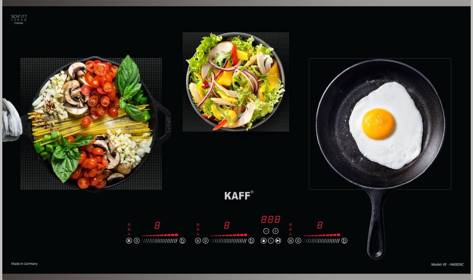 BẾP ĐIỆN TỪ KAFF KF-IH6003IC | NHẬP KHẨU NGUYÊN CHIẾC TỪ CHLB ĐỨC | THIẾT KẾ SANG TRỌNG | HỆ ĐIỀU KHIỂN CẢM ỨNG SLIDER CONTROL ĐỘC LẬP | AN TOÀN, BỀN BỈ VÀ TIẾT KIỆM ĐIỆN NĂNG   Đây là sản phẩm bếp có thiết kế đẹp nhất từ trước đến thời điểm này của hãng Kaff, bếp điện từ KF-IH6003IC mang phong cách hiện đại nhưng được nâng lên một tầm cao mới tinh tế hơn, hiện đại hơn và sở hữu một vẻ đẹp hoản hảo hơn.   Bếp điện từ Kaff KF-IH6003IC sử dụng mặt kính Schott Ceran được làm từ chất liệu gốm thủy tinh có khả năng chịu lực va đập và sốc nhiệt tới 1000 độ C, chống xước tốt nên tuổi thọ cao. Mặt bếp tản nhiệt nhanh và được cách điện an toàn với các linh kiện điện tử bên trong thân. Bạn có thể yên tâm sử dụng mà không lo bị bỏng hay điện giật. Đây là mặt kính chuyên dụng dành cho bếp điện từ, là một loại kính có chất lượng cao, rất cứng, bền và có nhiều đặc điểm nổi trội như: khả năng chịu nhiệt, khả năng chống trầy xước và chống va đập Mặt kính gồm các thấu kính hội tụ, truyền nhiệt từ bếp lên đáy nồi theo phương thẳng đứng, không thất thoát nhiệt ra môi trường. Mặt kính màu xám liền nguyên khối, an toàn, thẩm mỹ và tiện trong việc vệ sinh, lau chùi.   Bếp điện từ Kaff KF-IH6003IC gồm 3 vùng nấu có tổng công suất 5500W, vùng nấu từ lớn bên trái với công suất 1800W có khả năng đun nấu siêu nhanh và tiết kiệm điện năng có thể đạt mức công suất tối đa 3500W, vùng nấu từ nhỏ ở giữa với công suất 1500W có khả năng đun nấu siêu nhanh và tiết kiệm điện năng có thể đạt mức công suất tối đa 2500W và vùng nấu hồng ngoại bên phải trang bị mâm nhiệt E.G.O Hilight 02 vòng nhiệt với công suất tối đa 2200W. Chỉ trong chốc lát sau khi kích hoạt tính năng này, nhiệt lượng trên vùng nấu từ tăng lên công suất tương đương với mức nhiệt lượng lớn nhất. Do đó, các món ăn được nấu chín nhanh hơn, tiết kiệm thời gian vào bếp cho chị em nội trợ. Chức năng Booster nấu siêu nhanh, tuy nhiên thời gian tối đa mặc định dùng chức năng này là 10 phút / lần tránh quá tải.   Bếp điện từ Kaff KF-IH6003IC với công nghệ Inverter thông minh vượt trội giúp làm giảm lượng tiêu thụ điện của các sản phẩm có sử dụng lõi từ của bếp từ. Ngoài ra công nghệ Inverter còn giúp bếp từ điều chỉnh mức công suất phù hợp để không làm tiêu thụ nhiều điện năng. Bếp điện từ Kaff KF-IH6003IC với cảm biến thông minh sẽ cố định công suất tiêu thụ điện khi đun nấu, không bật tắt liên tục như các bếp từ thông thường khác (tự động điều chỉnh liên tục để đảm bảo mức nhiệt tương đương bằng với con số hiển thị trên bàn điều khiển).   Bếp điện từ Kaff KF-IH6003IC được ứng dụng công nghệ Inverter giúp tiết kiệm tối đa điện năng mà bếp vẫn đạt hiệu suất xử lý cao nhất trong quá trình sử dụng.   Bạn có thể tận dụng các loại xoong, nồi vì bếp điện không kén nồi, phù hợp với nhiều kích cỡ. Ưu điểm của bếp điện hơn hẳn các sản phẩm khác là có thể nướng trực tiếp lên bề mặt. Nướng thịt, rau củ, hải sản thơm ngon. Bạn nên vệ sinh sạch sẽ mặt bếp sau khi sử dụng. Hoạt động của bếp điện là truyền nhiệt lên mặt kính rồi mới lên đáy nồi nên mặt kính bếp rất nóng. Sau khi nấu, bạn có thể tận dụng hâm nóng thức ăn trên bếp. Ngược lại với vùng điện, bếp từ chỉ hơi nóng vùng nấu. Hiệu suất nấu lên tới 90%. Chức năng nhận diện vùng nấu chỉ sinh nhiệt vùng đáy nồi, tránh nồi thất thoát nhiệt ra ngoài.   Bếp điện từ Kaff KF-IH6003IC trang bị nhiều tiện ích hữu dụng giúp việc nấu ăn trở lên nhanh chóng và dễ dàng hơn.   Bếp điện từ Kaff KF-IH6003IC được tích hợp chức năng tự nhận diện vùng nấu, khi ta đặt nồi lên 1 trong 2 vùng nấu sau đó ấn nút khởi động bếp sau thời gian 1-2 giây bếp sẽ tự động tìm vùng nấu đã có nồi, ta chỉ việc điều chỉnh mức công suất to nhỏ theo ý muốn mà không phải thao tác chọn vùng nấu như bếp thông thường. Công nghệ Inverter được áp dụng trên bếp điện từ Kaff KF-IH6003IC có khả năng phản ứng thay đổi công suất theo điều khiển ngay tức thì, khi người dùng điều chỉnh tăng giảm nhiệt độ đun nấu, bếp điều chỉnh thay đổi tức thì về mức nhiệt độ mong muốn.   Bếp điện từ Kaff KF-IH6003IC sử dụng bảng điều khiển cảm ứng Slider Control hiện đại với 9 cấp độ công suất nhiệt độ khác nhau, điều khiển dễ dàng bằng một ngón tay, mọi chương trình nấu đều được hiển thị qua đèn Led sắc nét để bạn điều chỉnh cho phù hợp với các món ăn. Bếp còn được trang bị thêm các chức năng nấu thông minh như tạm dừng và hâm nóng.   Bếp điện từ Kaff KF-IH6003IC thiết kế bảng điều khiển dạng trượt Slider Control độc lập cho từng vùng nấu cùng các tiện ích được cài đặt sẵn. Siêu nhạy, dễ dàng sử dụng và phù h