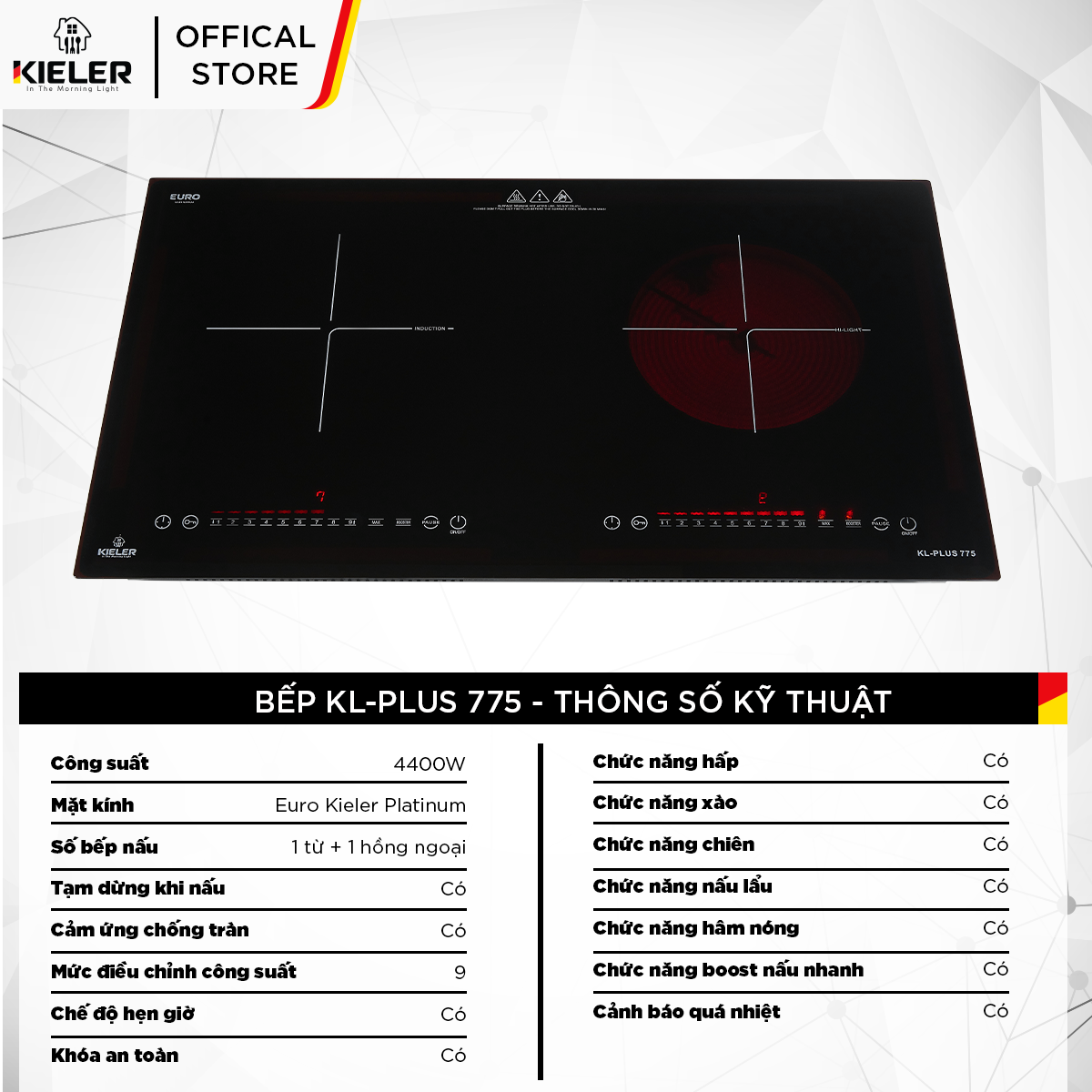 - Tên sản phẩm: Bếp đôi điện từ hồng ngoại Kieler KL-Plus 775 mặt kính Euro Kieler Platinum, Bếp đôi có chế độ cảm ứng chống tràn 4400W