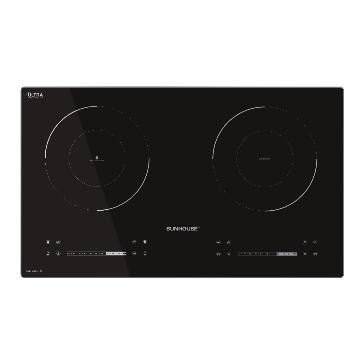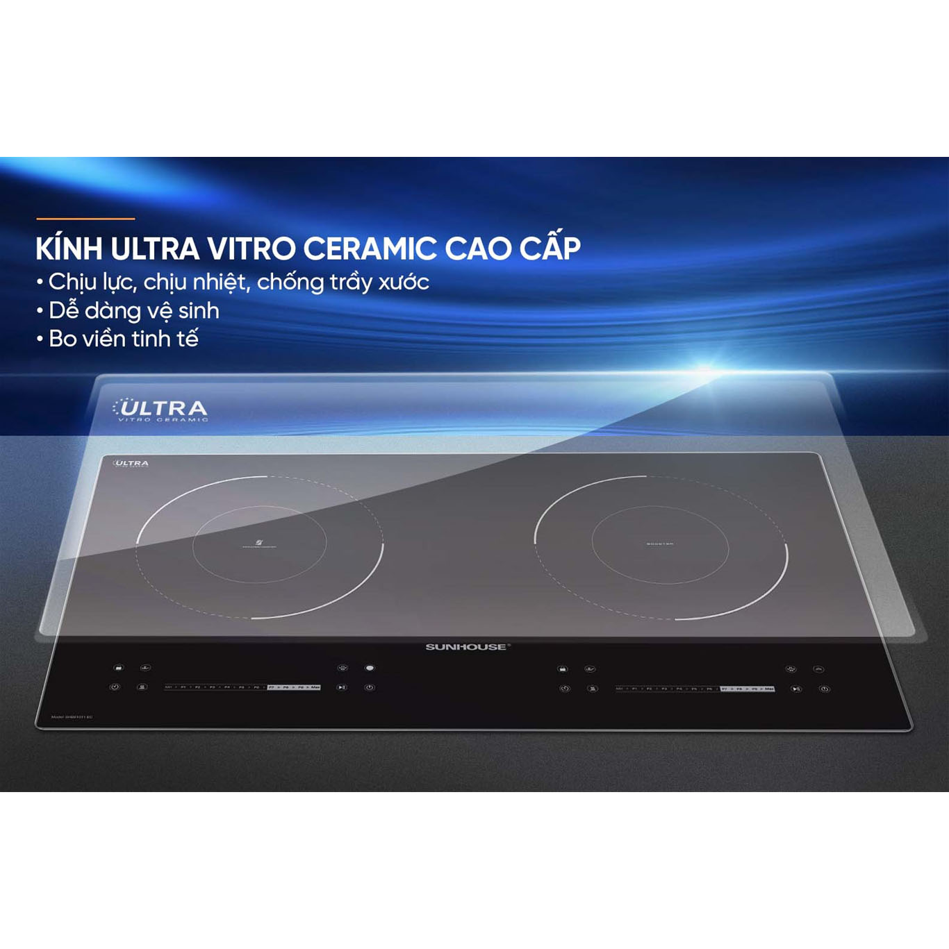 Mặt kính của sản phẩm bếp đôi điện từ hồng ngoại SUNHOUSE SHB81011-EC được sản xuất trên nền chất liệu Ultra Vitro Ceramic cao cấp, có khả năng truyền nhiệt tốt và độ bền thách thức thời gian. Đi cùng với mặt kính đen nguyên khối là đường viền kim loại bo tròn 4 góc tinh tế nhằm đảm bảo độ chắc chắn cho thiết kế đồng thời mang lại điểm nhấn sang trọng cho không gian bếp.
