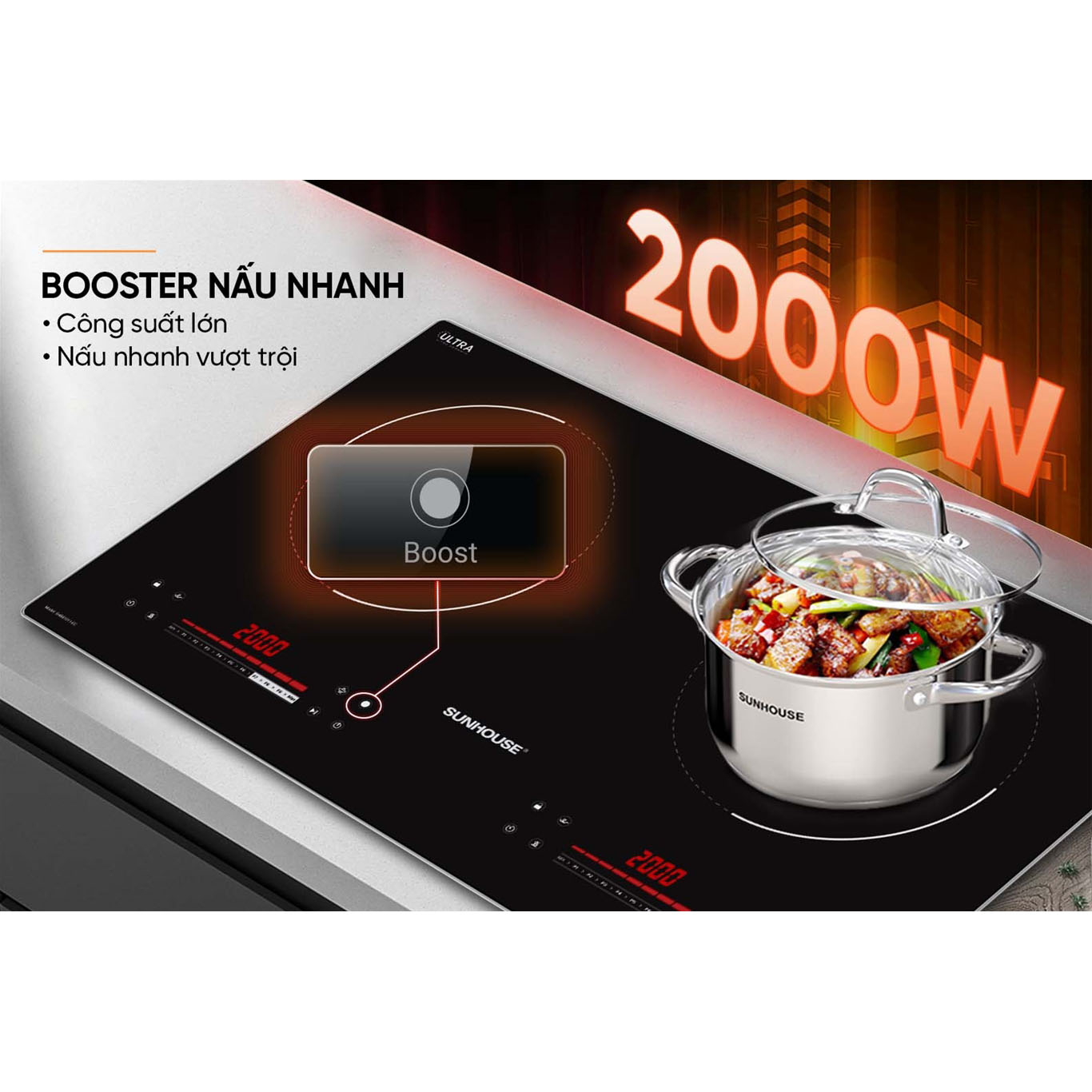 Khi chọn chức năng Booster (thường được kí hiệu chữ B trên bảng điều khiển), công suất của bếp sẽ được gia tăng lên tối đa giúp rút ngắn tới 50% thời gian nấu. Với chế độ ưu việt này, bạn có thể đun sôi 1 lít nước chỉ trong vòng từ 2-3 phút thay vì 5-7 phút khi nấu bằng bếp gas thông thường. Ngoài ra, bạn có thể tận dụng chức năng Booster để xào rau củ, thịt bò… vì nó khiến cho nguyên liệu chín nhanh hơn đồng thời giữ trọn được dưỡng chất cũng như hương thơm vốn có của thức ăn.