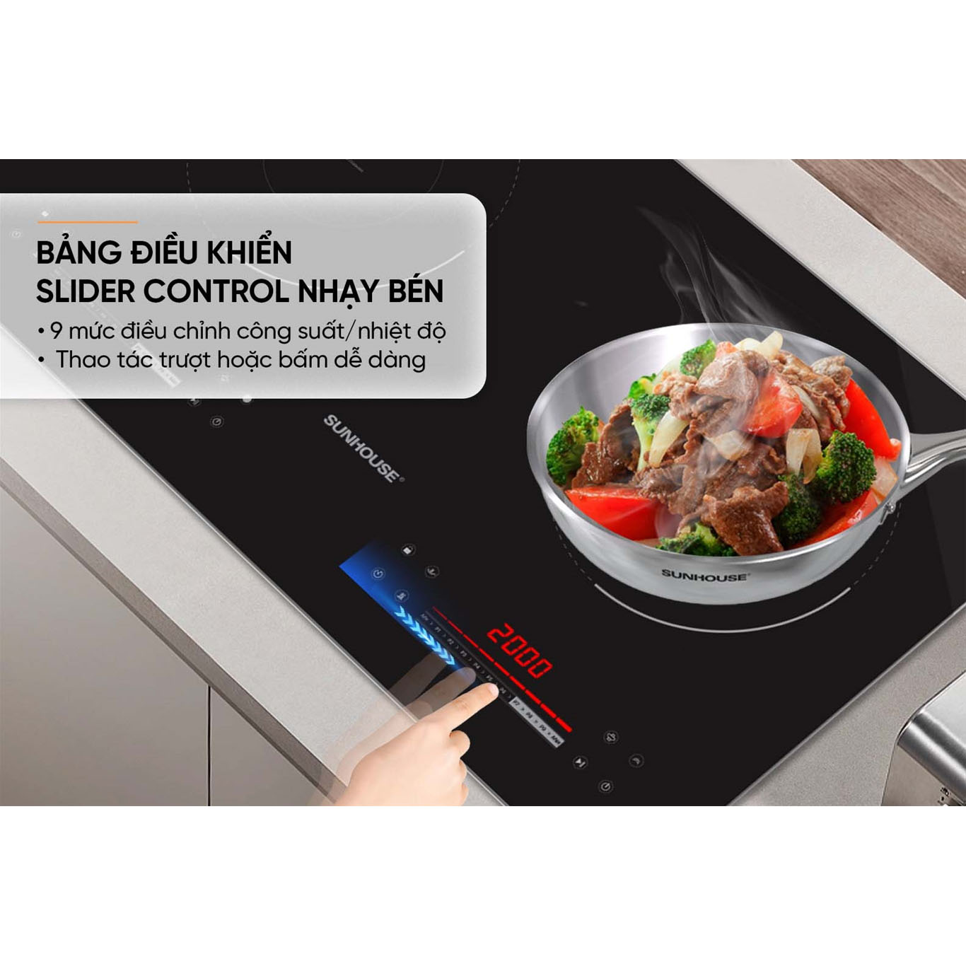 Sản phẩm được trang bị bảng điều khiển Slider Control riêng biệt ở cả hai vùng nấu với thiết kế tối giản, mang tính thẩm mỹ cao. Người sử dụng chỉ cần thực hiện thao tác lướt nhẹ ngón tay trên hệ thống bàn phím là đã có thể lựa chọn được mức nhiệt và chế độ nấu mong muốn.