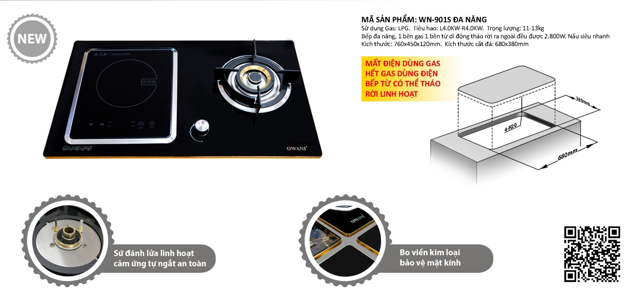 Bếp Gas Âm Kết Hợp Bếp Điện Từ Cảm Ứng OWANI WN-901S - Hàng Chính Hãng với lò nấu đánh lửa bằng Pin IC và được kết hợp chức năng cảm ứng ngắt gas khi có khí gas rò gỉ bảo vệ an toàn cho người sử dụng. Lò nấu có năng lượng gas tiêu thụ là 0,3 kg gas/h/lò.
