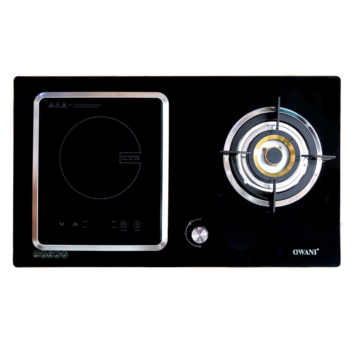 Bếp Gas Âm Kết Hợp Bếp Điện Từ Cảm Ứng OWANI WN-901S - Hàng Chính Hãng có mặt bếp điện bằng kính siêu bền, chống xước, chịu được nhiệt độ lớn, tránh cho bề mặt bếp bị biến dạng hoặc nóng chảy. Ngoài ra, với chất liệu kính sáng bóng giúp người dùng dễ dàng làm sạch sau khi sử dụng.