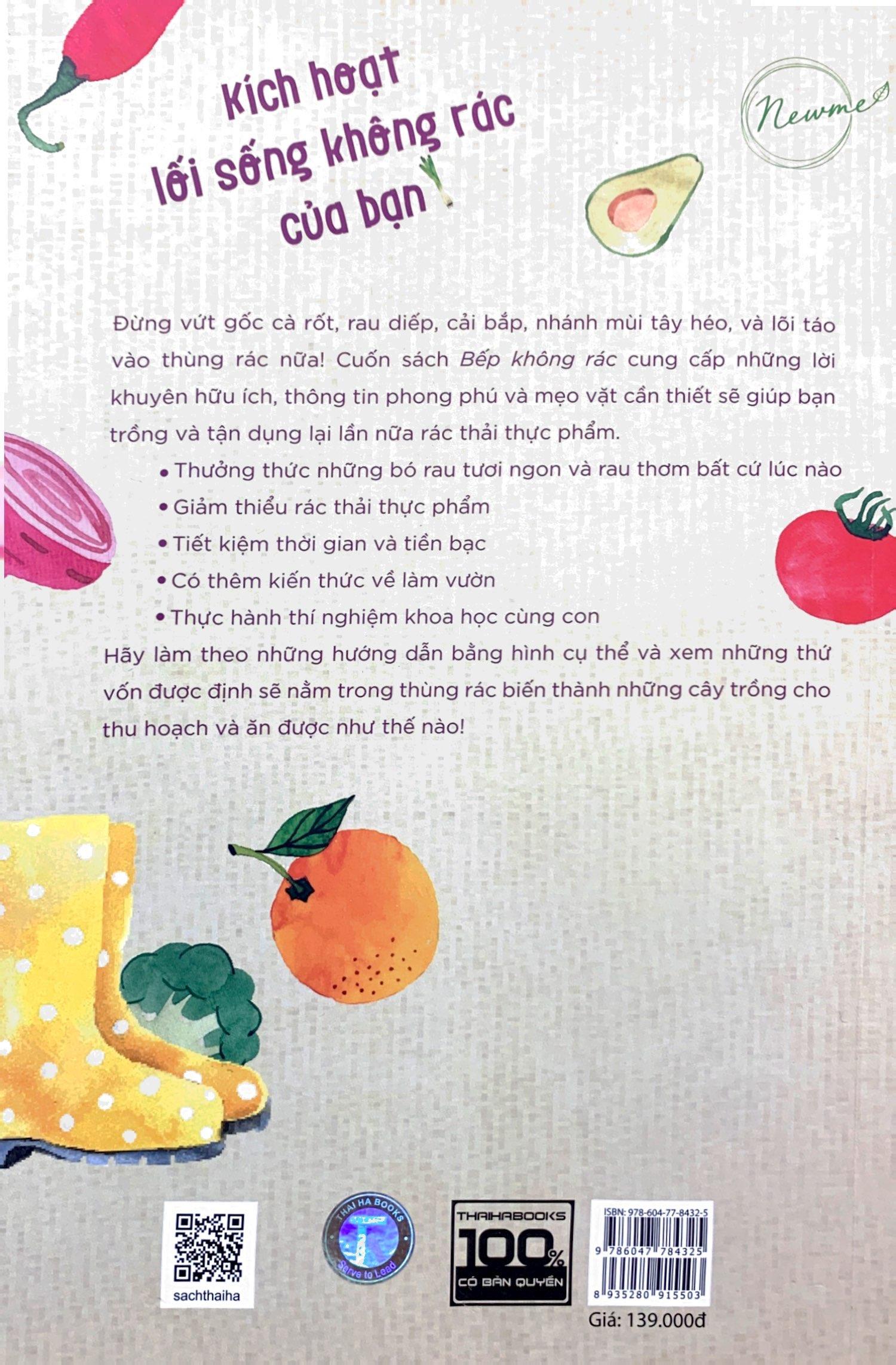 Bếp Không Rác - Tái Sinh Rau Củ Xã hội của chúng ta phát triển được là nhờ lối sống tái sử dụng và tái chế ngay từ những ngày đầu lập nước và những cuộc chiến tranh thế giới tới một xã hội đề cao sự tiện lợi và chủ nghĩa tiêu dùng trong những năm hậu chiến, và kết quả là rất nhiều rác thải – vỏ lon, vỏ chai, túi nhựa, Nhưng nhiều năm nay, xu hướng đã nghiêng về phía có ý thức hơn. Hiện nay, phong trào chính trị và xã hội cổ súy lối sống “không rác” chắc chắn đã sát cánh cùng chúng ta, như đã thấy trên các tạp chí, sách vở và các cuộc tranh luận chính trị – chưa nói đến việc nhiều người đang âm thầm sống theo phương châm đó. Những ngày này, một số người đã tuân thủ rất tốt nguyên tắc sống không rác tới mức một năm họ thải ra không quá một bao rác. Hầu hết chúng ta không nhất thiết phải làm và làm được y như thế. Nhưng chúng ta có thể nhìn lại cuộc sống hằng ngày của m.ình và tìm xem m.ình có thể tái chế, tái sử dụ và thậm chí tái trồng cái gì hay không – tái trồng, chính là chủ đề của cuốn sách này. Một khi bạn đã bắt đầu, sống theo kiểu ít hoặc không rác gần như có thể trở thành một trò chơi, nhưng trò chơi này đem đến kết quả hữu hình. Càng ngày, người tiêu dùng ở mọi lứa tuổi càng bước sâu vào lối sống không rác vì nhiều lý do và quan điểm cá nhân khác nhau. Một số vì thái độ sống “xanh” và cảm thấy cần thiết phải bảo vệ hành tinh này, trong khi có những người thấy vấn đề tự cung tự cấp là điều cấp bách và muốn có thể sống tốt trong bất cứ tình huống nào. Dù động cơ là gì thì những người muốn sống một đời không rác này đều có rất nhiều cách thực tế để bắt đầu. LỐI SỐNG KHÔNG RÁC Những người sống không rác luôn tìm cách cắt giảm rác thải, tiết kiệm nước và làm xanh sạch ngôi nhà và mảnh vườn của m.ình. Và có không ít cách để thực hiện điều đó. Trước hết, khi bạn đi mua đồ, hãy tìm những món mà đồ đựng có thể tái chế hoặc tái sử dụng. Nếu có thể, hãy mua sỉ và chọn sản phẩm nào không được đóng gói. Hãy đổ rác từ sân vườn (lá rụng, cành cây, cỏ, lá cỏ xén) vào hố để làm phân hữu cơ hoặc đưa vào chương trình thu gom rác phân hủy sinh học của thành phố. Chỉ cần để ý một chút thôi, bạn sẽ thấy có rất nhiều cách đơn giản để bảo quản và tái sử dụng nước, góp phần rất lớn vào việc tiết kiệm tài nguyên môi trường. Hãy đặt thùng đựng nước dưới ống dẫn nước mưa trên mái nhà để tưới cây trồng trong chậu, khay. Luôn có một xô khoảng 20 lít dưới mỗi vòi hoa sen trong nhà tắm để trữ nước lạnh lúc đầu bạn mở vòi trước khi nước nóng lên. Bạn có thể sử dụng nước đó để tưới cho cây trồng trong nhà. Sau khi đã trụng mỳ Ý và rau, giữ nước đó lại, để nguội dùng làm nước tưới cây bên ngoài. Chúng ta thường xem làm vườn là hành động “xanh”, nhưng thực ra nó cũng có thể thải ra khá nhiều rác: cây trồng mới trong các chậu nhựa, trấu công nghiệp phủ đất và phân bón cũng đều là một nguồn rác thải. Xuất phát điểm cho việc làm vườn không rác là tái sử dụng tất cả sinh khối (cành lá rụng, lá cỏ cắt xén) trong vườn. Từ cành khô đến cỏ xén, cỏ nhổ, tới những thứ rác phân hủy từ vụ tổng vệ sinh vườn tược năm ngoái, vườn của bạn đã sinh ra nhiều vật chất hữu cơ. Thay vì đổ những thứ đó vào thùng rác, hãy chặt nhỏ chúng ra làm trấu, hoặc dựng một đống phân hữu cơ để bón đất. Thay vì năm nào cũng mua cây mới trồng trong chậu nhựa, hãy học cách gieo chính những hạt giống mà m.ình có. Hãy tham gia các chương trình đổi cây, ở đó, mọi người mang cây đến và đổi cho nhau. Chậu cũ, cốc sữa chua, và cả hộp đựng thức ăn hiệu Tupperware bị mất nắp, tất cả đều là những lựa chọn tuyệt vời để chia sẻ cây trồng. Trước khi vứt mọi thứ đi, hãy nghĩ xem có thể tái sử dụng chúng vào việc gì khác không. Tủ đựng tài liệu, xe cút kít cũ và những thứ đồ cũ khác đều có thể tạo ra những khu vườn thú vị và ngộ nghĩnh. Bạn có thể lấy đồ dùng cũ để tạo ra lưới mắt cáo hoặc cọc rào thú vị. Cuối cùng, sống không rác có nghĩa là nấu những gì bạn cần và ăn những gì bạn nấu, nhưng nó cũng có nghĩa là tận dụng cho kỳ hết mọi nguyên liệu nấu nướng. Khi nấu nướng rau củ quả, nếu để ý, bạn sẽ thấy thế nào m.ình cũng để lại một đống rác lớn mà thường là sẽ bị tống vào các hố rác phân hủy hữu cơ. Khoan đã nào! Giờ chúng ta sẽ thử một cách sống không rác triệt để nhất. Thực ra, bạn có thể tái trồng rất nhiều thứ từ rác thải nhà bếp thay vì làm phân hữu cơ. Hãy thử bàn đến chuyện sống không rác một cách triệt để nhất nhé! MỤC LỤC: