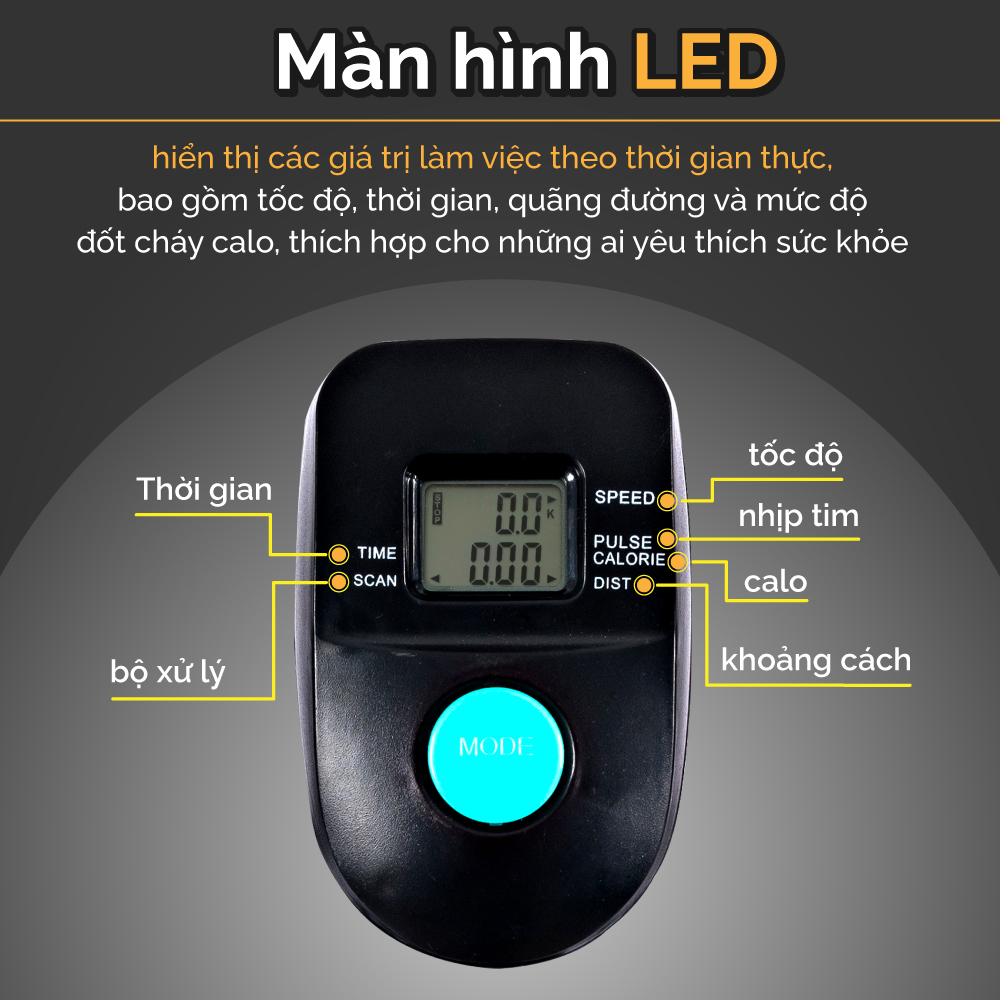 Trọng lượng tối đa người sử dụng: 125kg Cốt thanh tay cầm và yên xe bằng crom Màn hình LED hiển thị trực quan, dễ dàng quan sát Trang bị giá đựng chai nước và