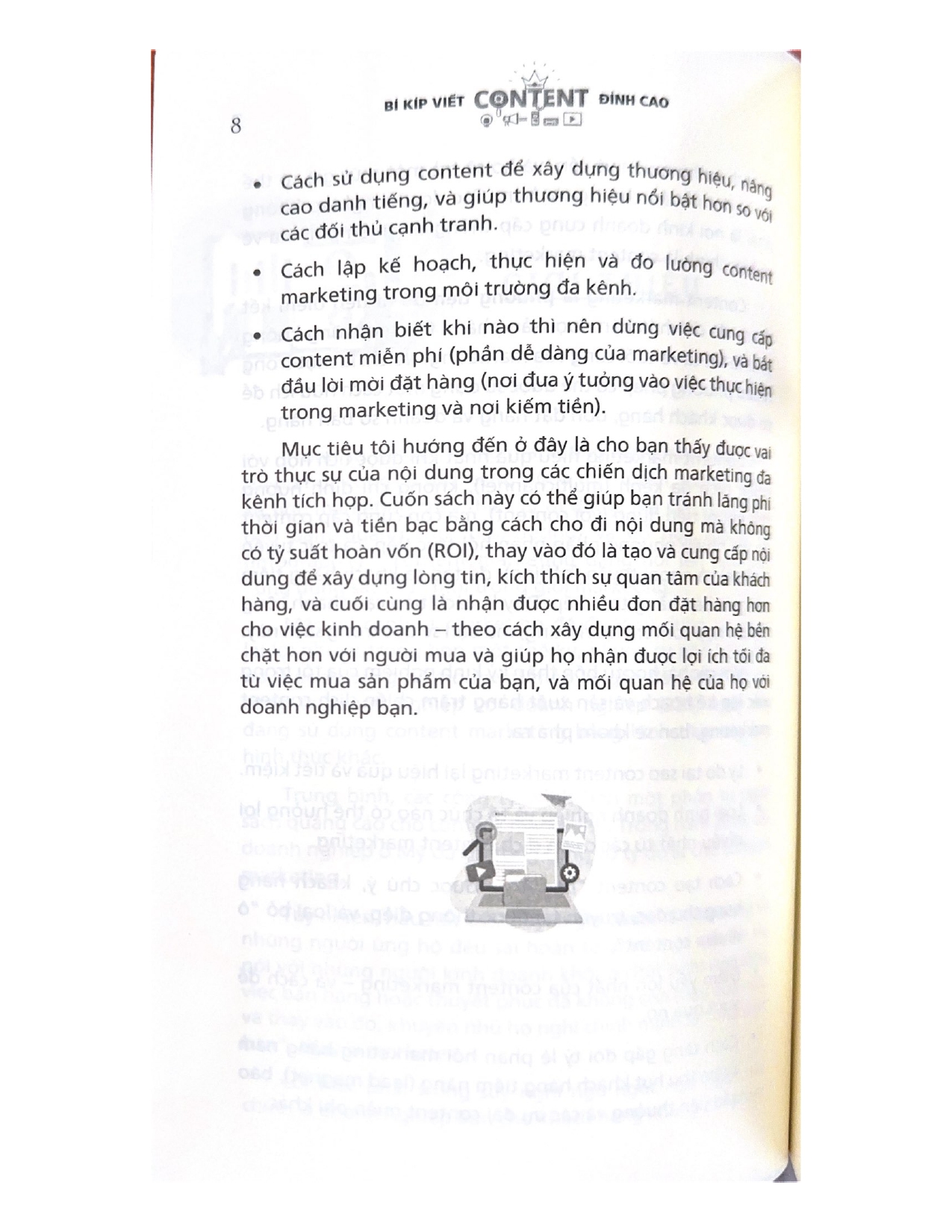 Bí Kíp Viết Content Đỉnh Cao giúp các doanh nhân, marketer và chủ doanh nghiệp nhỏ hiểu được vai trò thực sự của content trong các chiến dịch marketing đa kênh tích hợp, tránh lãng phí thời gian và tiền bạc bằng cách cứ tạo content mà không có tỷ suất hoàn vốn (ROI). Thay vào đó, sách hướng dẫn cách tạo và cung cấp nội dung để xây dựng lòng tin, kích thích sự quan tâm của khách hàng, và chạm đến mục đích cuối cùng của việc kinh doanh là bán hàng.