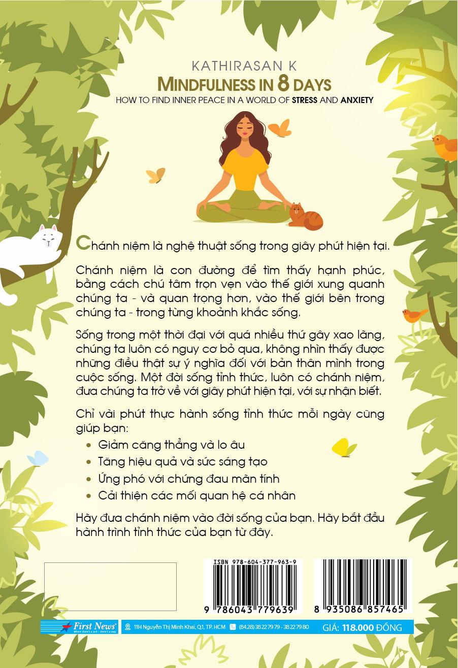 Khi đi qua 8 chương sách tương ứng với 8 ngày thực hành, bạn đọc sẽ học cách sống trọn vẹn giây phút hiện tại thông qua việc xem xét lại và nhìn nhận đúng đắn ý nghĩa thật sự của chánh niệm và những khái niệm có liên quan như “sự chú tâm”, “một thái độ lành mạnh”, “cái nhìn không phán xét”, “cái vai tôi đang mang không phải là tôi”, “trạng thái đang-là”, “người chứng kiến”