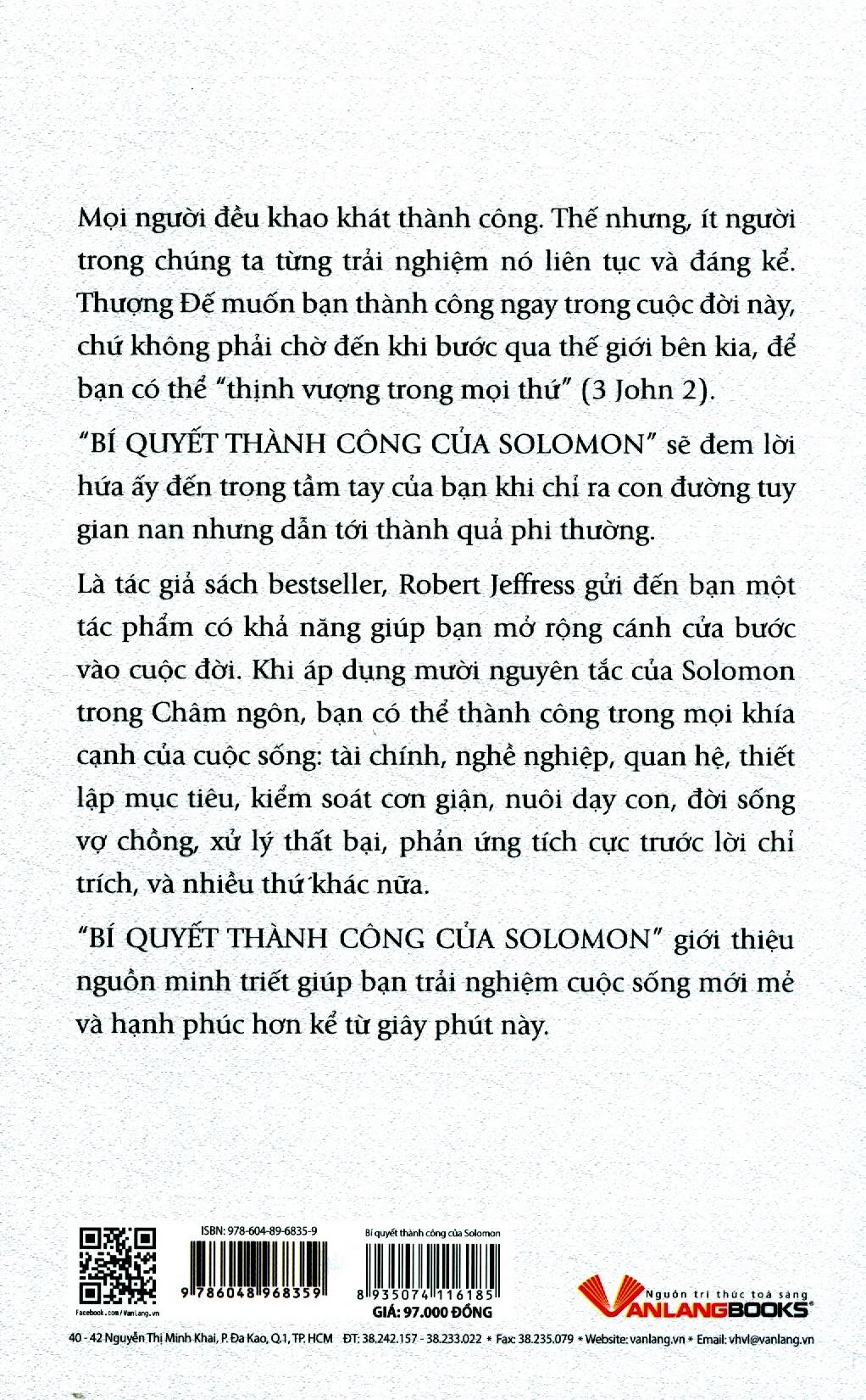 Bí quyết thành công của Solomo sẽ đem lời hứa ấy đến trong tầm tay của bạn khi chỉ ra con đường tuy gian nan nhưng dẫn tới thành quả phi thường. Là tác giả sách bestseller, Robert Jeffress gửi đến bạn một tác phẩm có khả năng giúp bạn mở rộng cánh cửa bước vào cuộc đời. Khi áp dụng mười nguyên tắc của Solomon trong Châm ngôn, bạn có thể thành công trong mọi khía cạnh của cuộc sống: tài chính, nghề nghiệp, quan hệ, thiết lập mục tiêu, kiểm soát cơn giận, nuôi dạy con, đời sống vợ chồng, xử lý thất bại, phản ứng tích cực trước lời chỉ trích, và nhiều thứ khác nữa. Bí quyết thành công của Solomon giới thiệu nguồn minh triết giúp bạn trải nghiệm cuộc sống mới mẻ và hạnh phúc hơn kể từ giây phút này .