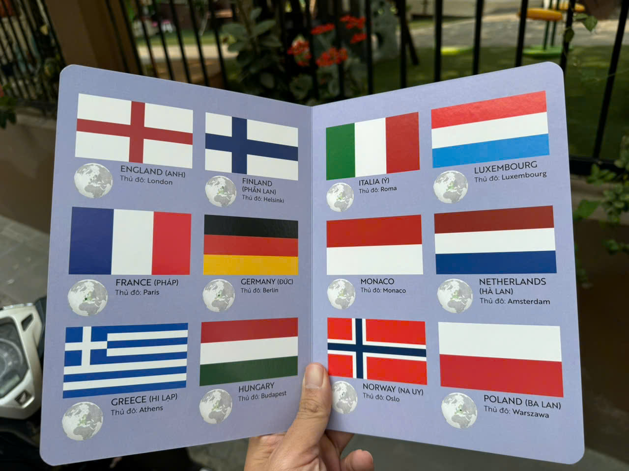 Cuốn sách dày 20 trang được in hoàn toàn bằng giấy bồi cứng giúp bé mở rộng vốn hiểu biết, nhận diện quốc kỳ, vị trí địa lý, tên gọi, thủ đô của hơn 100 quốc gia. Cuốn sách giúp bé bước vào hành trình khám phá thế giới ngay từ những năm tháng đầu đời!