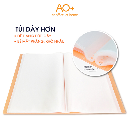 Thương hiệu: AO+ Xuất xứ : Việt Nam ĐẶC TÍNH NỔI BẬT: - Gáy đặc biệt, tự co dãn, mềm mại, thích ứng với mọi loại tài liệu - Túi đựng tài liệu trong suốt,