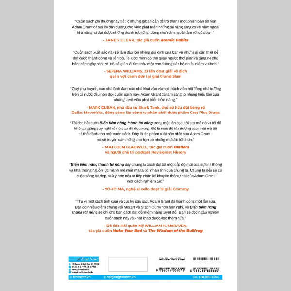 “Biến tiềm năng thành tài năng” (tựa gốc: Hidden Potential) của Adam Grant là một tác phẩm đầy cảm hứng, giúp người đọc hiểu sâu hơn về cách khai phá tiềm năng thật sự của bản thân và của những người xung quanh. Thay vì tập trung vào tài năng thiên bẩm hay những thành công ban đầu, Grant lập luận rằng tiềm năng là một quá trình phát triển liên tục, được hình thành từ những nỗ lực có chủ đích, sự kiên trì, phản hồi tích cực và các môi trường hỗ trợ. Với một cách tiếp cận khoa học và thực tiễn, Grant mở ra một con đường rõ ràng để giúp mọi người đạt được thành công to lớn hơn.