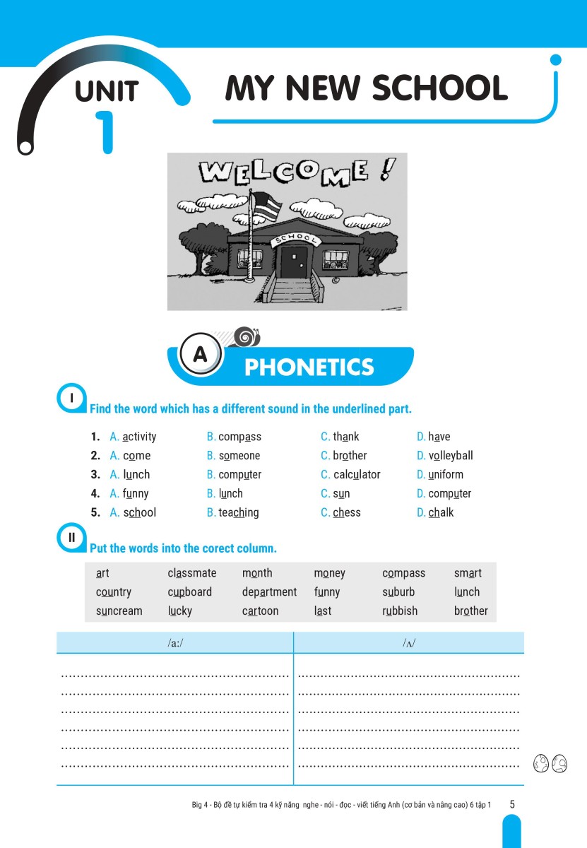 - Nội dung được biên soạn một cách khoa học, theo khung chương trình mới nhất của Bộ Giáo dục và Đào tạo Big 4 - Bộ đề Tự kiểm tra 4 kỹ năng NGHE – NÓI – ĐỌC – VIẾT được biên soạn theo chương trình mới của Bộ Giáo Dục và Đào Tạo. Đây là nguồn tài liệu hữu ích cho giáo viên, phụ huynh và các em học sinh bên cạnh bộ sách giáo khoa cơ bản. Cấu trúc của mỗi Unit gồm 6 phần A. Phonetics B. Vocabulary And Grammar C. Reading D. Speaking E. Listening F. Writing