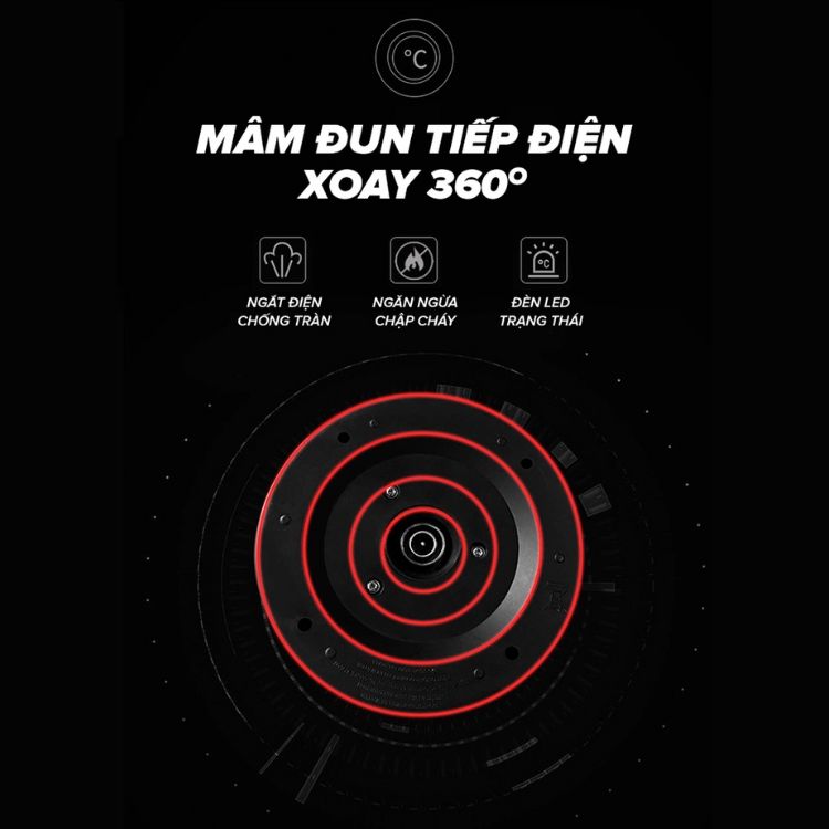 ĐẶC ĐIỂM NỔI BẬT - Đèn báo hiệu bật tắt - Tự động tắt khi sôi hoặc trào nước trong lúc đun - Thân ấm bằng thép không gỉ - Cấu tạo đế xoay 360
