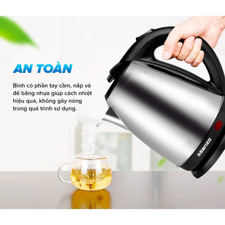 Bình Đun Siêu Tốc Asanzo SK1800 Thiết kế kiểu dáng trang nhã, vỏ ngoài bằng thép không gỉ, lòng nồi bằng inox ngăn ngừa bám bẩn, dễ dàng vệ sinh. Hơn hết là an toàn vệ sinh cho người sử dụng. Đế nhiệt và tay cầm bằng nhựa chịu nhiệt, cách nhiệt tốt không gây nóng, bỏng cho người dùng,  được làm bằng inox đạt tiêu chuẩn an toàn thực phẩm, bóng đẹp và có khả năng chống cháy khi quá nhiệt, bảo đảm an toàn cho người dùng. Asanzo SK1800 đang được rất nhiều gia đình lựa chọn và tin dùng bởi sự tiện dụng nhanh chóng và an toàn tuyệt đối. Bình Đun Siêu Tốc Asanzo SK1800 được sản xuất theo công nghệ hiện đại của Nhật Bản, và lắp ráp tại Việt Nam, đem lại cho bạn nhiều tiện ích thú vị cũng như là bền đẹp với thời gian, dưới đây là vài đặc điểm nổi bật của chiếc bình này. Bình sử dụng đế tiếp điện rời xoay 360 độ, mâm nhiệt ẩn, an toàn và tiện dụng hơn so với ấm sử dụng sợi đốt. Bộ phận cảm ứng nhiệt cực nhạy sẽ tự động ngắt điện khi nước sôi giúp chống trào nước, cạn nước, bảo đảm độ bền cho sản phẩm và phòng tránh cháy nổ. Bạn cần nấu nước nhanh để pha trà, pha cà phê, ăn mì tôm…hay bất cứ một mục đích nào khác thì Bình Đun Siêu Tốc Asanzo SK1800 là sự lựa chọn hoàn hảo việc bạn cần làm là cho nước vào ấm rồi cắm điện chờ khoảng 5 đến 7 phút là nước đã sôi rồi. Bình đun siêu tốc này rất an toàn và chắc chắn bởi thân bình làm bằng inox 304 dày khoảng 4 mm mang lại độ chắc chắn bền bỉ, chịu lực, chịu nhiệt rất tốt. Bên cạnh đó chiếc bình đun này còn sử dụng chế độ sôi tự ngắt vì thế chiếc bình này rất an toàn và tiện ích. Bên cạnh đó chiếc bình đun siêu tốc này cũng rất tiết điện năng và dễ dàng lau chùi vệ sinh khi thân bình làm bằng inox chống xước chống bụi bẩn …Tay cầm Ấm đun siêu tốc Asanzo SK1800 cực chắc chắn và vừa tay nên bạn rất dễ dàng để rót nước vào những tô mì hay những bình trà đãi khách.  Ấm đun siêu tốc Asanzo SK1800 cũng là một vật trang trí cho không gian bếp của bạn thêm sang trọng. Sản phẩm tiết kiệm năng lượng khi sử dụng. Hiệu quả như một chiếc phích điện, sản phẩm có độ bền cao và rất tiện ích trong cuộc sống. Dù ở bất cứ đâu, nhà riêng hay nơi công sở bạn hoàn toàn thoải mái nhâm nhi những tách trà, café nóng hổi với Bình Đun Siêu Tốc Asanzo SK1800 tiện dụng. Những điểm cần lưu ý khi sử dụng Bình đun siêu tốc Asanzo SK1800 Để việc sử dụng Asanzo SK1800 được an toàn, nhanh chóng hiệu quả và lâu dài với thời gian các bạn cần chú ý một vài điểm sau: