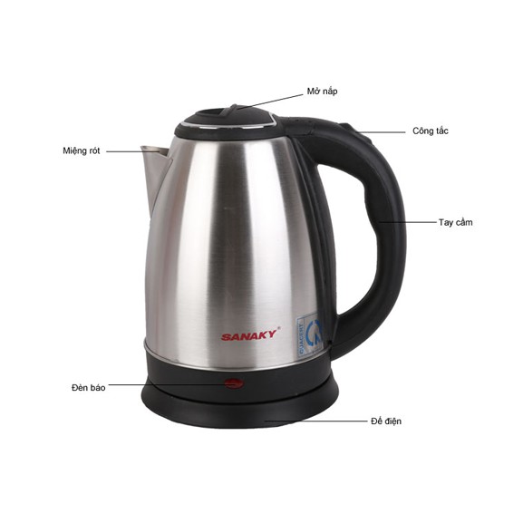 - Đế tiếp điện xoay 360 độ dễ dàng di chuyển. Ấm siêu tốc được làm từ inox cực tốt nhưng lại có giá bán rất ưu đãi. Chất liệu inox an toàn cho sức khỏe, khi tiếp xúc với nhiệt độ cao không sinh ra chất độc hại. Ấm siêu tốc Sanaky có dung tích là 1.8 lít đáp ứng được nhu cầu sử dụng cho gia đình có từ 4 – 6 người. Tay cầm có tích hợp công tắc bấm rất thuận tiện. Phần đế và tay cầm bằng nhựa chống nóng giúp bạn dễ dàng di chuyển ấm siêu tốc. Bình đun nước siêu tốc có đèn báo hoạt động giúp người dùng nắm bắt được tình trạng của ấm. Công suất hoạt động lớn 1.500W sẽ đun nước sôi nhanh chóng chỉ sau vài phút. Người sử dụng sẽ có ngay nước nóng để dùng mà không phải chờ đợi lâu. Ấm siêu tốc 1.8 lít có trang bị rơ le tự ngắt khi nước sôi sẽ đảm bảo an toàn tuyệt đối khi sử dụng. Ấm sử dụng nguồn điện 220V/50Hz, hoạt động ổn định và bền bỉ. Thông số kỹ thuật của bình đun siêu tốc Sanaky SNK-18N-1S Model SNK-18N-1S Hãng sản xuất SANAKY Chất liệu Inox Dung tích (lít) 1.8 lít Công suất đun (W) 1800W Chế độ an toàn Tự ngắt khi nước sôi và khi cạn nước Nguồn điện 220V 50-60Hz Xuất xứ Trung Quốc Bảo hành 12 tháng