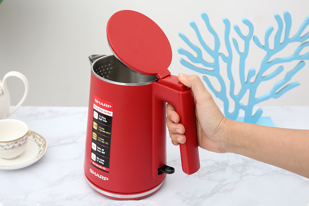 Bình đun siêu tốc Sharp EKJ-10DVPS-RD sở hữu màu đỏ pastel nổi bật, bắt mắt có dung tích 1 lít Đáp ứng tốt nhu cầu nước nóng để pha mì tôm, pha sữa, trà, sử dụng trong gia đình 2 - 3 thành viên. Ruột bình làm bằng inox SUS 304 bền bỉ, không rỉ sét, dễ dàng lau chùi; vỏ bằng nhựa BPA certify cách nhiệt, an toàn sử dụng Trang bị lưới lọc bã trà tiện dụng, ngăn chặn côn trùng xâm nhập vào bên trong bình. Công suất mạnh mẽ lên đến 1260 - 1500W đun sôi nước nhanh, tiết kiệm thời gian và điện năng Công tắc nút bật có đèn báo hoạt động phát sáng khi bình đang đun và ngắt khi nước sôi, an toàn, tiện theo dõi hoạt động Bình đun siêu tốc Sharp có chế độ tự ngắt khi nước sôi hay bình cạn nước giảm tối đa tình trạng chập cháy. Xem thêm: Ưu điểm của đèn báo hoạt động. Đế tiếp điện Jiatal cao cấp, bền tốt, xoay 360 độ, nhấc đặt bình lên xuống nhẹ nhàng, tiện lợi Xem thêm: Các loại đế tiếp điện của bình đun siêu tốc. Bình đun siêu tốc Sharp EKJ-10DVPS-RD nhỏ gọn, bắt mắt, sở hữu nhiều tiện ích hiện đại đáp ứng tốt nhu cầu sử dụng nước nóng của gia đình 2 - 3 thành viên.