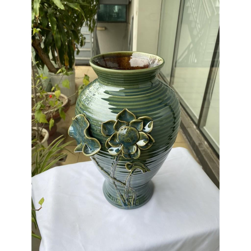 Mua tại TiktokBình hoa Bát Tràng cao cấp, hàng chuẩn loại 1 với kiểu dáng đùi ếch (phần đáy bình nhỏ, phình to ở phần trên và miệng bình) phối với họa tiết hoa đắp nổi cầu kỳ, thực hiện 100% bằng tay trên thân bình. Sản phẩm có nước men căng bóng, sáng loáng, mịn màng với màu xanh ghi nổi bật. Sản phẩm cực kỳ phù hợp với cắm những loại hoa dáng cao, chùm xòe rộng như hoa sen, hồng, ly, tạo nên một sản phẩm sống động, tinh tế. Trưng bày bình hoa trong nhà, trong phòng khách, phòng làm việc, phòng ngủ, văn phòng công ty, cửa hà giúp tạo nên một không gian ấn tượng, thu hút, hấp dẫn, tạo nên những cảm xúc mới lạ cho cả gia chủ lẫn khách đến chơi. Sản phẩm cao 35cm, miệng bình 14cm, vòng bụng bình 68cm