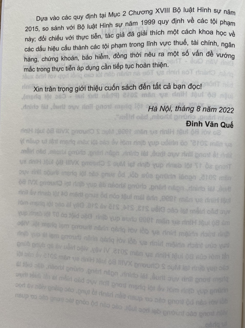 Tiếp theo các cuốn “Bình luận Bộ luật Hình sự năm 2015…”, tác giả Đinh Văn Quế – Thạc sỹ Luật học, nguyên Thành viên Hội đồng Thẩm phán, Chánh Tòa hình sự Tòa án nhân dân tối cao phối hợp với Nhà xuất bản Thông tin và Truyền thông tiếp tục cho ra mắt bạn đọc cuốn “Bình luận Bộ luật Hình sự năm 2015 (Phần thứ hai – Các tội phạm), Chương XVIII, Mục 2: Các tội phạm trong lĩnh vực thuế, tài chính, ngân hàng, chứng khoán, bảo hiểm”. So với Bộ luật Hình sự năm 1999, Mục 2 Chương XVIII Bộ luật Hình sự năm 2015 có nhiều quy định mới về các tội  trật tự quản lý kinh tế trong lĩnh vực thuế, tài chính, ngân hàng, chứng khoán, bảo hiểm. Trong số 17 tội danh quy định tại Mục 2 Chương XVIII Bộ luật Hình sự năm 2015, ngoài những sửa đổi, bổ sung các tội phạm thuộc lĩnh vực thuế, tài chính, ngân hàng, chứng khoán đã quy định tại Chương XVI Bộ luật Hình sự năm 1999, nhà làm luật còn bổ sung thêm 04 tội danh về lĩnh vực bảo hiểm tại các Điều 213, 214, 215 và 216. Đây là các tội phạm mới mà Bộ luật Hình sự năm 1999 chưa quy định. Đặc biệt có 07 tội danh quy định trách nhiệm hình sự đối với pháp nhân thương mại phạm tội. Việc truy cứu trách nhiệm hình sự đối với pháp nhân thương mại là quy định rất mới của Bộ luật Hình sự năm 2015. Vì vậy, việc hiểu và áp dụng đúng các quy định tại Mục 2 Chương XVIII Bộ luật Hình sự năm 2015 về các tội phạm trong lĩnh vực thuế, tài chính, ngân hàng, chứng khoán, đặc biệt là những quy định mới về tội phạm trong lĩnh vực bảo hiểm là rất thiết thực đối với cán bộ trong các cơ quan tiến hành tố tụng, các giảng viên và học viên trong các trường đại học luật, các cán bộ công tác trong các cơ quan tư pháp… Dựa vào các quy định tại Mục 2 Chương XVIII Bộ luật Hình sự năm 2015, so sánh với Bộ luật Hình sự năm 1999 quy định về các tội phạm này; đối chiếu với thực tiễn, tác giả đã giải thích một cách khoa học về các dấu hiệu cấu thành các tội phạm trong lĩnh vực thuế, tài chính, ngân hàng, chứng khoán, bảo hiểm, đồng thời nêu ra một số vấn đề vướng mắc trong thực tiễn áp dụng cần tiếp tục hoàn thiện. Xin trân trọng giới thiệu cuốn sách đến tất cả bạn đọc!